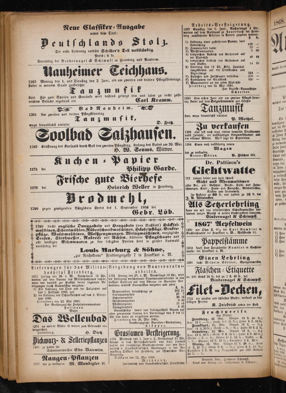 oben genanntem Bureau des Vormittags von 9 bis 12 Uhr von heute an eingesehen werden. Friedberg den 26. Mai 1868. Großherzogliche Garnison⸗ Verwaltung Klöpper.