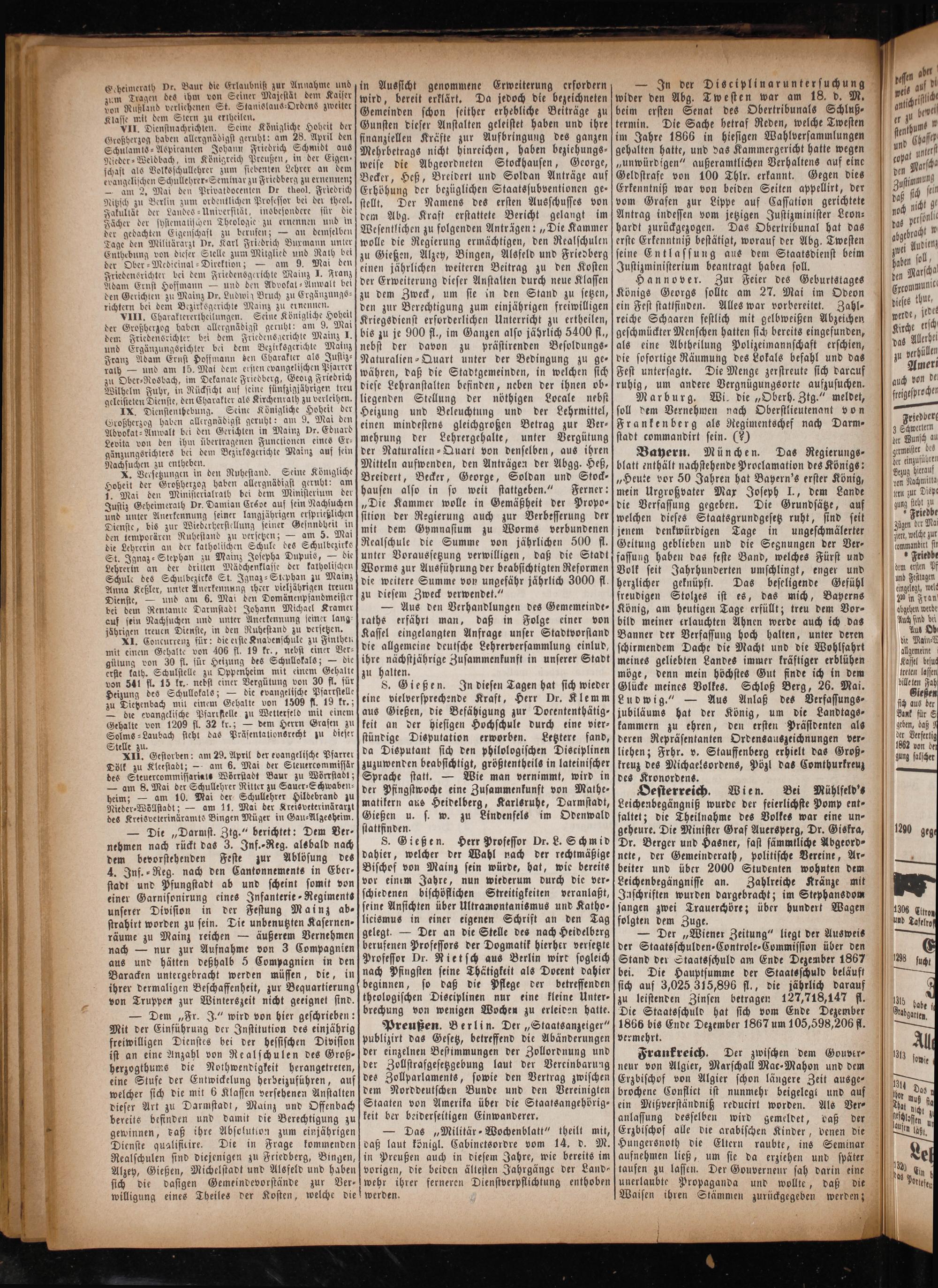 Geheimerath Dr. Baur die Erlaubniß zur Annahme und zum Tragen des ihm von Seiner Majestät dem Kaiser von Rußland verliehenen St. Stauislaus-Ordens zweiter Klasse mit dem Stern zu ertheilen. n VII. Dienstnachrichten. Seine Königliche Hoheit der Großherzog baben allergnädigst geruht: am 28. April den Schulamts⸗ Aspiranten Johann Friedrich Schmidt aus Nieder⸗Weidbach, im Königreich Preußen, in der Eigen: schaft als Volksschullehrer zum siebenten Lehrer an dem evaugelischen Schullehrer-Seminar zu Friedberg zu ernennenz — am 2. Mai den Privatdocentlen Dr theol. Friedrich Nitzsch zu Berlin zum ordentlichen Professor bei der theol. Fakultät der Landes-Universität, insbesondere für die Fächer der systematischen Theologie zu ernennen und in der gedachten Eigenschaft zu berufen;— an demselben Tage den Militärarzt Dr. Karl Friedrich Burmann unter Enthebung von dieser Stelle zum Mitglied und Rath bei der Ober-Medieinal- Direktion;— am 9. Mai den Friedensrichter bei dem Friedensgerichte Mainz I. Franz Adam Ernst Hoffmann— und den Advokal-Anwalt bei den Gerichten zu Mainz Dr. Ludwig Bruch zu Ergänzungs— richtern bei dem Bezirksgerichte Mainz zu ernennen. VIII. Charakterertheilungen. Seine Königliche Hoheit der Großherzog haben allergnädigst geruht: am 9. Mai dem Friedensrichter bei dem Friedensgerichte Mainz I. und Ergänzungsrichter bei dem Bezirksgerichte Mainz Franz Adam Ernst Hoffmann den Charakter als Justiz⸗ rath— und am 15. Mal dem ersien evangelischen Pfarrer zu Ober⸗Rosbach, im Dekanate Friedberg, Geoig Friedrich Wilhelm Fuhr, in Rücksicht auf seine fünfzigjährigen treu geleisteten Dienste, den Charakter als Kirchenrath zu verleihen. IX. Dienstenthebung. Seine Königliche Hoheit der Großherzog haben allergnädigst geruht: am 9. Mai den Advokat⸗Anwalt bei den Gerichten in Mainz Dr. Eduard Levita von den ihm übertragenen Functionen eines Er— gänzungsrichters bei dem Bezirksgerichte Mainz auf sein Nachsuchen zu entheben. e X. Versetzungen in den Ruhestand. Seine Könmgliche Hoheit der Großherzog haben allergnädigst geruht: am 1. Mai den Ministerialrath bei dem Ministerium der Justiz Geheimerath Dr. Damian Créde auf sein Nachsuchen und unter Anerkennung seiner langjährigen ersprießlichen Dienste, bis zur Wiederherstellung seiner Gesundheit in den temporären Ruhestand zu versetzen;— am 5. Mai die Lehrerin an der katholischen Schule des Schulbezirks St. Ignaz⸗ Stephan zu Mainz Josepha Dupuis,— die Lehrerin an der dritten Mädchenklasse der katholischen Schule des Schulbezicks St. Ignaz⸗Stephan zu Mainz Anna Keßler, unter Anerkennung ihder vieljährigen treuen Dienste,— und am 6. Mai den Domänenpfandmeister bei dem Rentamte Darmstadt Johann Michael Kramer auf sein Nachsuchen und unter Anerkennung seiner lang⸗ jährigen treuen Dienste, in den Ruhestand zu versetzen. XI. Concurrenz für: die erste Knabenschule zu Finthen mit einem Gehalte von 406 fl. 19 kr., nebst einer Ver⸗ gülung von 30 fl. für Heizung des Schullokals;— die erste kath. Schulstelle zu Oppenheim mit einem Gehalte von 541 fl. 15 kr. nedst einer Vergütung von 30 fl. für Heizung des Schullokals;— die evangelische Pfarrstelle zu Dietzenbach mil einem Gehalte von 1509 fl. 19 kr.; — die evangelische Pfarrstelle zu Wetterfeld mit einem Gehalte von 1209 fl. 32 kr.;— dem Herrn Grafen zu Solms⸗Laubach steht das Präsentationsrecht zu dieser Stelle zu. g XII. Gestorben: am 29. April der evangelische Pfarrer Dölk zu Kleestadt;— am 6. Mai der Steuercommissär des Steuercommissariats Wörrstadt Baur zu Wörrstadt; — am 8. Mai der Schullehrer Ritter zu Sauer⸗Schwaben⸗ heim;— am 10. Mai der Schullehrer Hildebrand zu Nieder⸗Wöllstabt;— am 11. Mai der Kreisveterinärarzt des Kreisveterinäramts Bingen Müger in Gau-Alzesheim.
