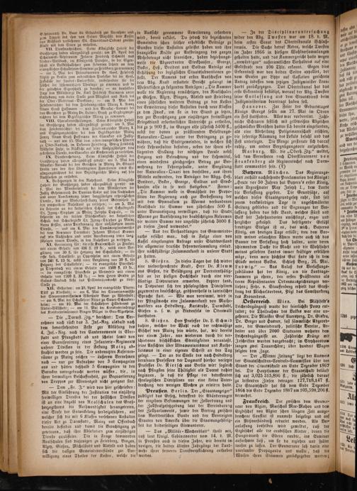 — Der„Wiener Zeitung“ liegt der Ausweis der Staatsschulden⸗Controle-⸗Commission über den Stand der Staatsschuld am Ende Dezember 1867 bei. Die Hauptsumme der Staatsschuld beläuft sich auf 3,025 315,896 fl., die jährlich darauf zu leistenden Zinsen betragen 127,718,147 fl. Die Staatsschuld hat sich vom Ende Dezember 1866 bis Ende Dezember 1867 um 105,598,206 fl. vermehrt.