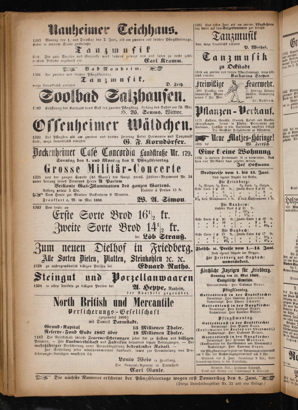 Die nächste Nummer erscheint der Pfingstfeiertage wegen erst Donnerstag den 4. Juni. 1 (Hierzu Unterhaltungsblatt Nr. 22 und eine Beilage.)