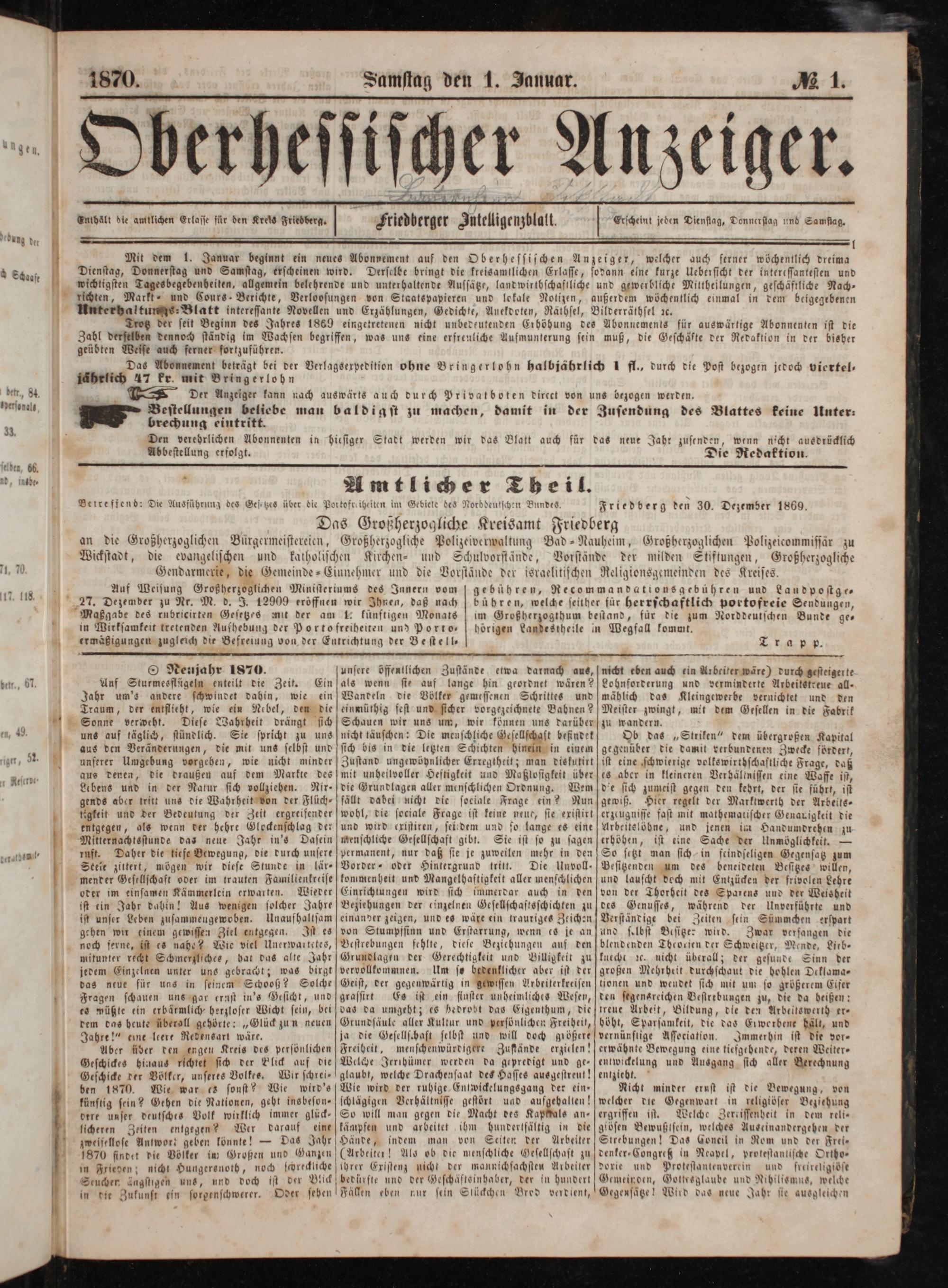 1. Januar beginnt ein neues Abonnement auf den Oberhessischen Anzeiger, welcher auch ferner wöchentlich dreima Derselbe bringt die kreisamtlichen Erlasse, sodann eine kurze Uebersicht der intertssantesten und