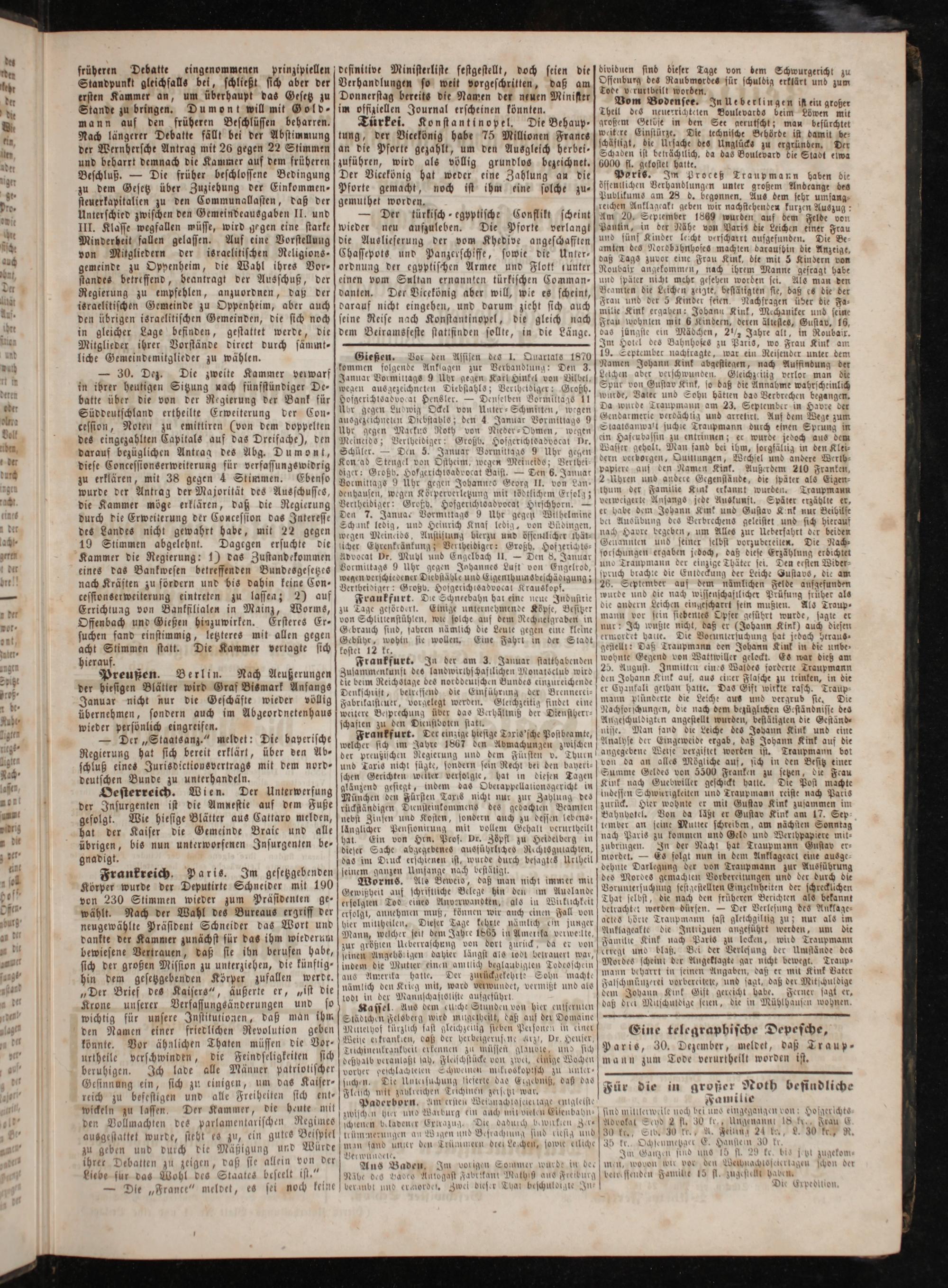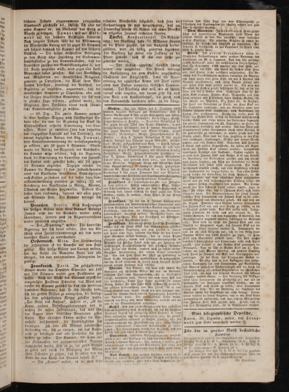 Eine telegraphische Depesche, Paris, 30. Dezember, meldet, daß Traup- mann zum Tode verurtheilt worden ist.