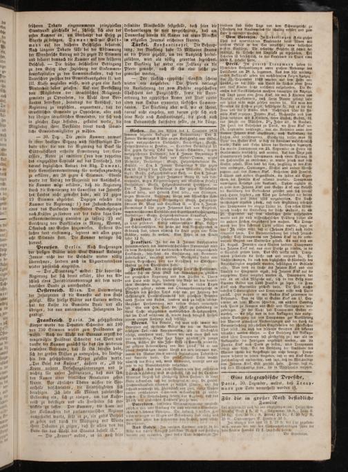 — 30. Dez. Die zweite Kammer verwarf in ibrer heutigen Sitzung nach fünfstündiger De— batte über die von der Regierung der Bank für Süddeutschland ertheilte Erweiterung der Con- cession, Noten zu emittiren(von dem doppelten des eingezahlten Capitals auf das Dreifache), den darauf bezüglichen Antrag des Abg. Dumont, diese Concessionserweiterung für verfassungswidrig zu erklären, mit 38 gegen 4 Stimmen. Ebenso wurde der Antrag der Majorität des Ausschusses, die Kammer möge erklären, daß die Regierung durch die Erweiterung der Concession das Interesse des Landes nicht gewahrt habe, mit 22 gegen 19 Stimmen abgelehnt. Dagegen ersuchte die Kammer die Regierung: 1) das Zustandekommen eines das Bankwesen betreffenden Bundesgesetzes nach Kräften zu fördern und bis dahin keine Con- cessionserweiterung eintreten zu lassen; 2) auf Errichtung von Bankfilialen in Mainz, Worms, Offenbach und Gießen hinzuwirken. Ersteres Er— suchen fand einstimmig, letzteres mit allen gegen acht Stimmen statt. Die Kammer vertagte sich hierauf.