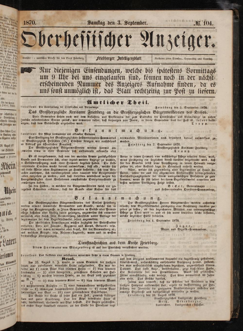 verwundete Militärpersonen noch besonders darauf aufwerksam zu machen. 5 Friedberg den 2. September 1870. Großherzogliches Kreisamt Friedberg Trapp.