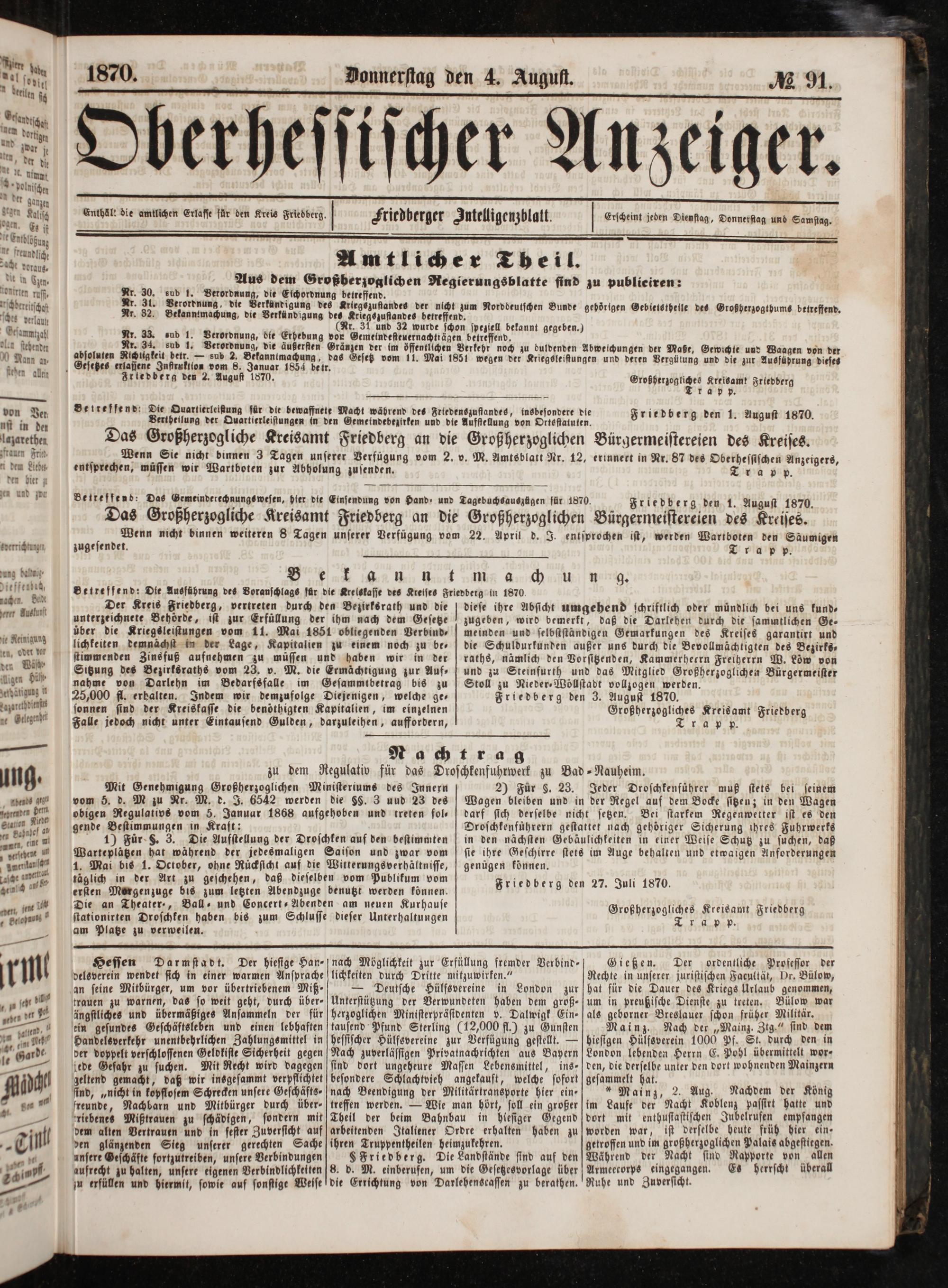 Das Großherzogliche Kreisamt Friedberg an die Großherzoglichen Bürgermeistereien des Kreises. Wenn Sie nicht binnen 3 Tagen unserer Verfügung vom 2. v. M. Amtsblatt Nr. 12, erinnert in Nr. 87 des Oberhessischen Anzeigers,
