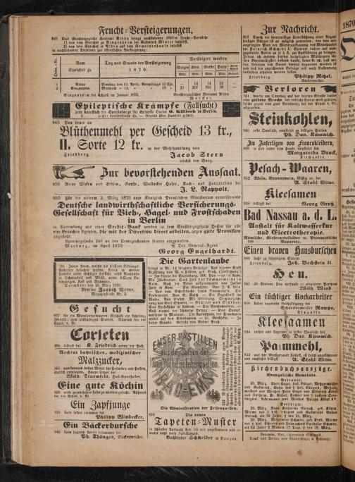 24 8 5 Versteigert werden 8 Vom Tag und Stunde der Versteigerung N 5 i erste] Hafer 5 2 Speicher zu 18 7 0. Walzen Korn rst Stroh. 8 Mitr. Mitr. Mitr. Mitr. Gebund. 1 Nidda Dienstag den 12. April, Vormittags 10 Uhr,“— 64 34 53— 2 Bingenheim Mittwoch» 13.„ 1 10„ 23 207 203 38— Bingenheim bei Echzell im Januar 1870. Wuff N Nidda e e r.