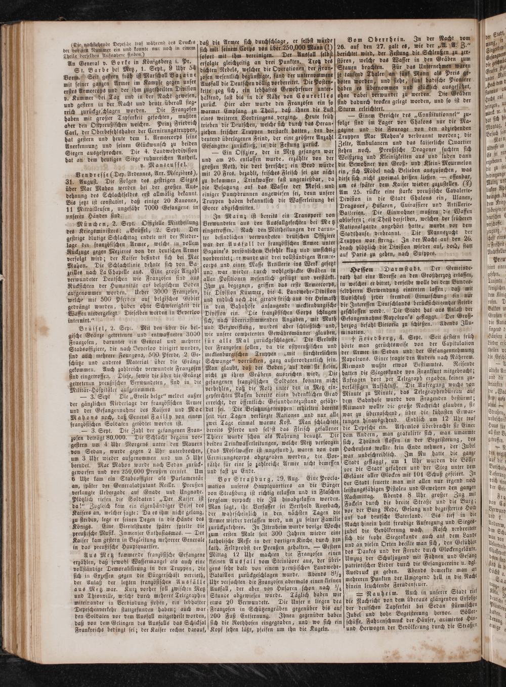 — 3. Sept. Die Zahl der gefangenen Fran— zosen beträgt 80,000. Die Schlacht begann vor⸗ gestern um 4 Uhr Morgens unter den Mauern von Sedan, wurde gegen 2 Uhr unterbrochen, um 3 Uhr wieder aufgenommen und um 5 Uhr beendet. Mac Mahon wurde nach Sedan zurück— geworfen und von 250,000 Preußen cernirt. Um 6 Uhr kam ein Stabsoffizier als Parlamentär an, später der Generaladjutant Reille. Preußen verlangte Uebergabe auf Gnade und Ungnade. Plötzlich riefen die Soldaten:„Der Kaiser ist da!“ Zugleich kam ein eigenhändiger Brief des Kaisers an, welcher sagte: Da es ihm nicht gelang, zu sterben, lege er seinen Degen in die Hände des Königs. Eine Viertelstunde später spielte die preußische Musik. Immenser Enthusiasmus.— Der Kaiser kam gestern in Begleitung mehrerer Generale in das preußische Hauptquartier.