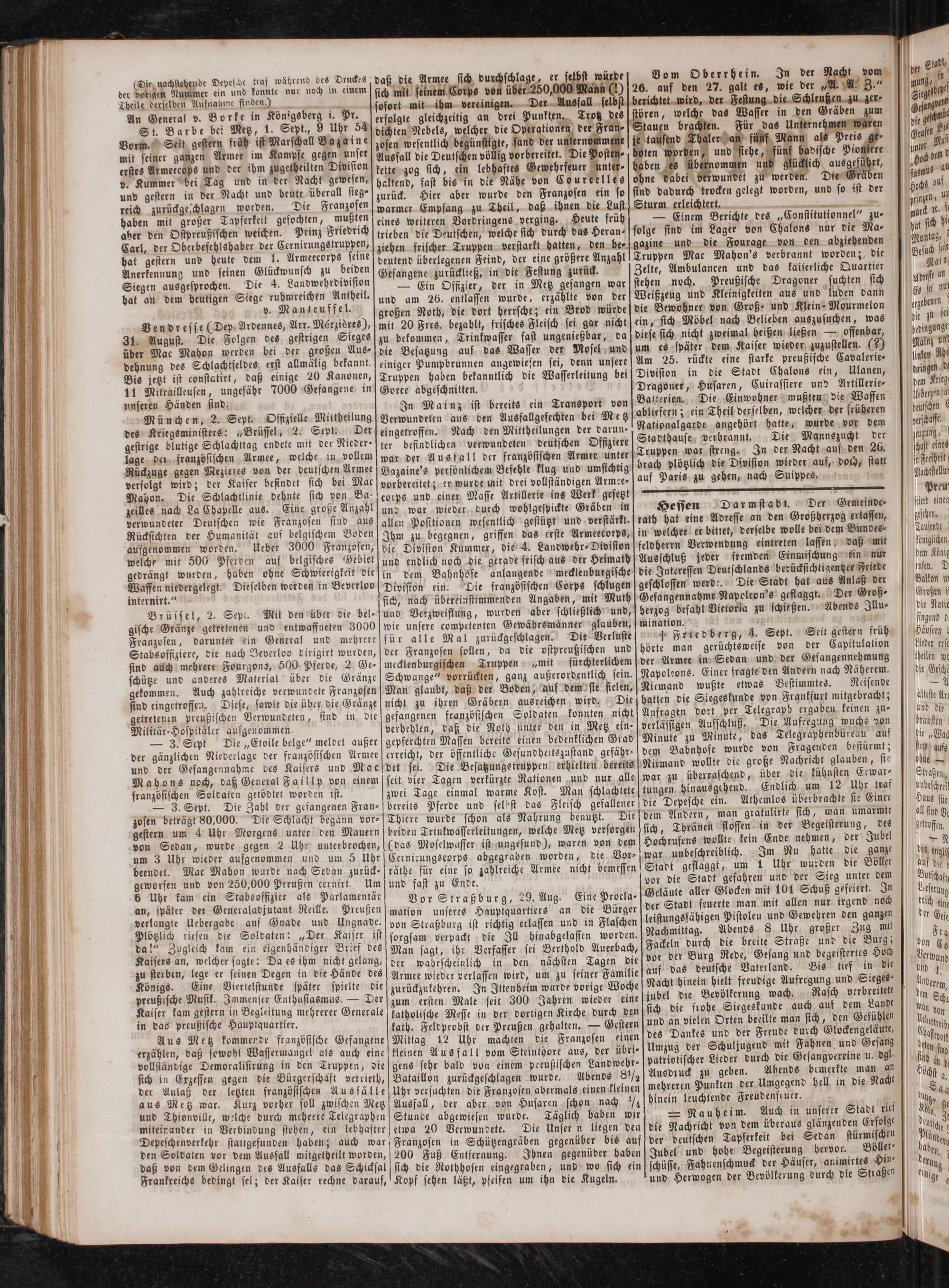 Hessen Darmstadt. Der Gemeinde⸗ rath hat eine Adresse an den Großherzog erlassen, in welcher er bittet, derselbe wolle bei dem Bundes⸗ feldherrn Verwendung eintreten lassen; daß mit Ausschluß jeder fremden Einmischung ein nur die Interessen Deutschlands berücksichtigender Friede geschlossen werde. Die Stadt hat aus Anlaß der Gefangennahme Napoleon's geflaggt. Der Groß⸗ berzog befahl Victoria zu schießen. Abends Illu⸗ mination. n af 30 + Friedberg, 4. Sept. Seit gestern früh hörte man gerüchtsweise von der Capitulation der Armee in Sedan und der Gefangennehmung Napoleons. Einer fragte den Andern nach Näherem. Niemand wußte etwas Bestimmtes. Reisende hatten die Siegeskunde von Frankfurt mitgebracht; Anfragen dort per Telegraph ergaben keinen zu⸗ verlässigen Aufschluß. Die Aufregung wuchs von Minute zu Minute, das Telegraphenbüreau auf dem Bahnhöfe wurde von Frageuden bestürmt; Niemand wollte die große Nachricht glauben, ste war zu überraschend, über die kühnsten Erwar⸗ tungen hinausgehend. Endlich um 12 Uhr traf die Depesche ein. Athemlos überbrachte sie Einer dem Andern, man gratulirte sich, man. umarmte sich, Thränen flossen in der Begeisterung, des Hochrufens wollte kein Ende nehmen, der Jubel war unbeschreiblich. Im Nu hatte die ganze Stadt geflaggt, um 1 Uhr wurden die Böller vor die Stadt gefahren und der Sieg unter dem Geläute aller Glocken mit 101 Schuß gefeiert. In der Stadt feuerte man mit allen nur irgend noch leistungsfähigen Pistolen und Gewehren den ganzen Nachmittag. Abends 8 Uhr großer Zug mit Fackeln durch die breite Straße und die Burg; vor der Burg Rede, Gesang und begeistertes Hoch auf das deutsche Vaterland. Bis tief in die Nacht hinein hielt freudige Aufregung und Sieges“ jubel die Bevölkerung wach Rasch verbreitete sich die frohe Siegeskunde auch auf dem Lande und an vielen Orten beeilte man sich, den Gefühlen des Dankes und der Freude durch Glockengeläute, Umzug der Schuljugend mit Fahnen und Gesang patriotischer Lieder durch die Gesangvereine u. dgl. Ausdruck zu geben. Ahends bemerkte man an mehreren Punkten der Umgegend hell in die Nacht hinein leuchtende Freudenfcuer. f = Nauheim. Auch in unserer Stadt rief die Nachricht von dem überaus glänzenden Erfolge