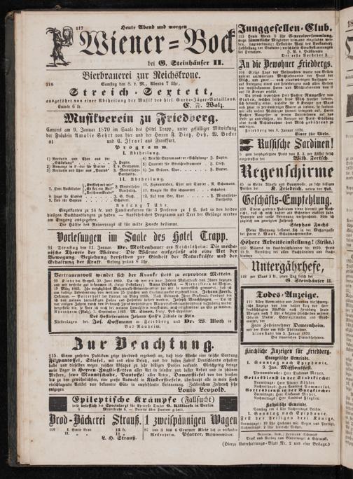 . 7 ils Musikverein zu Friedberg. Concert am 9. Januar 1870 im Saale des Hötel Trapp, unter gefälliger Mitwirkung der Fräulein Amalie Sehrt von hier und der Herren F. Dietz, Heß, W. Becker 81 und C. Israel aus Frankfurt.