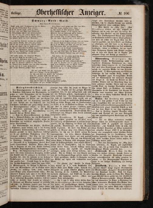 — Am 2. und 3. sollen wieder stärkere Aus- fälle der Straßburger Garnison stattgefun⸗ den haben, die zurückgeschlagen wurden, jedoch nicht ohne einen bedeutenden Verlust der Unsrigen. Näheres ist noch nichts bekannt. Zur Vermeidung