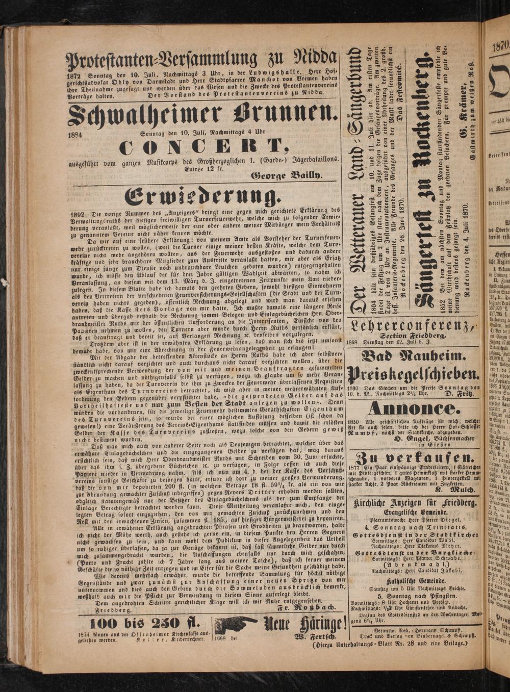 1872 Sonntag den 10. Juli, Nachmittags 3 Uhr, in der Ludwigshalle. Herr Hof⸗ gerichtsadvokat Ob ly von Darmstadt und Herr Stadtpfarrer Manchot von Bremen haben ihre Theulnahme zugesagt und werden über das Wesen und die Zwecke des Protestantenvereins Vorträge halten. Der Vorstand des Protestanten vereins zu Nidda.