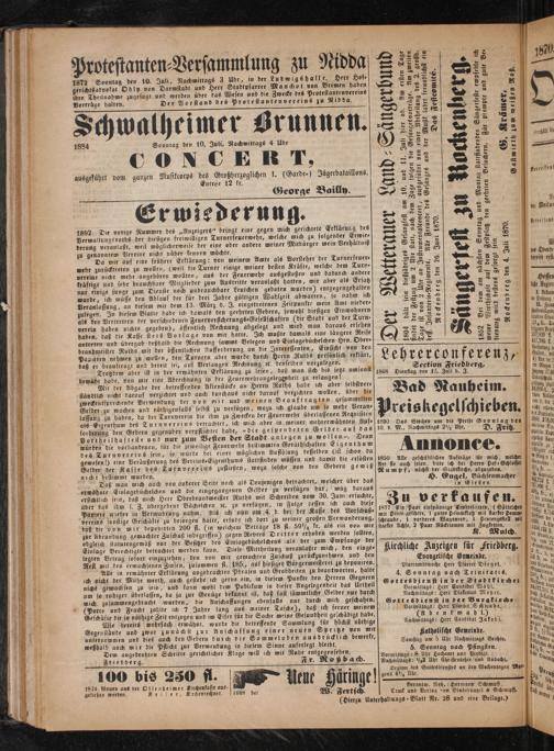 zur Abrundung gemachter Zuschuß inbegriffen) gegen Revers Dritter erhoben werden sollten, obgleich statutengemäß nur der Besitzer des Einlagebüchelchens als der zum Empfange der Einlage Berechtigte betrachtet werden kann. Diese Mittheilung veranlaßte mich, den einge⸗ legten Betrag sofort einzuziehen, den von mir gemachten Zuschuß zurückzunehmen und den Rest mit den erwachsenen Zinsen, zusammen fl. 185., auf hiesiger Bürgermeisterei zu deponiren. Alle in erwähnter Erklärung angebrachten Phrasen und Grobheiten zu beantworten, halte ich nicht der Mühe werth, auch gestehe ich gerne ein, in diesem Punkte den Herren Gegnern nicht gewachsen zu sein, und kann wohl dem Publikum in dieser Angelegenheit das Urtheil um so ruhiger überlassen, da ja zur Genüge bekannt ist, daß fast sämmtliche Gelder nur durch mich, zu sammengebracht wurden, die Anschaffungen ebenfalls nur durch mich geschahen, (Porto und Fracht zahlte ich 7 Jahre lang aus meiner Tasche), daß ich ferner meinem Geschäfte die so nöthige Zeit entzogen und im Eifer für die Sache meine Gesundheit geschädigt habe. Wie bereits mehrfach erwähnt, wurde die betreffende Sammlung für höchst nöthige Gegenstände und zwar zunächst zur Anschaffung einer neuen Spritze von mir unternommen und dies auch den Gebern durch die Sammelnden ausdrücklich bemerkt, weßhalb auch mir die Pflicht zur Verwendung in diesem Sinne auferlegt bleibt. Dem angedrohten Schritte gerichtlicher Klage will ich mit Ruhe entgegensehen. Friedberg. Fr. Roß bach.