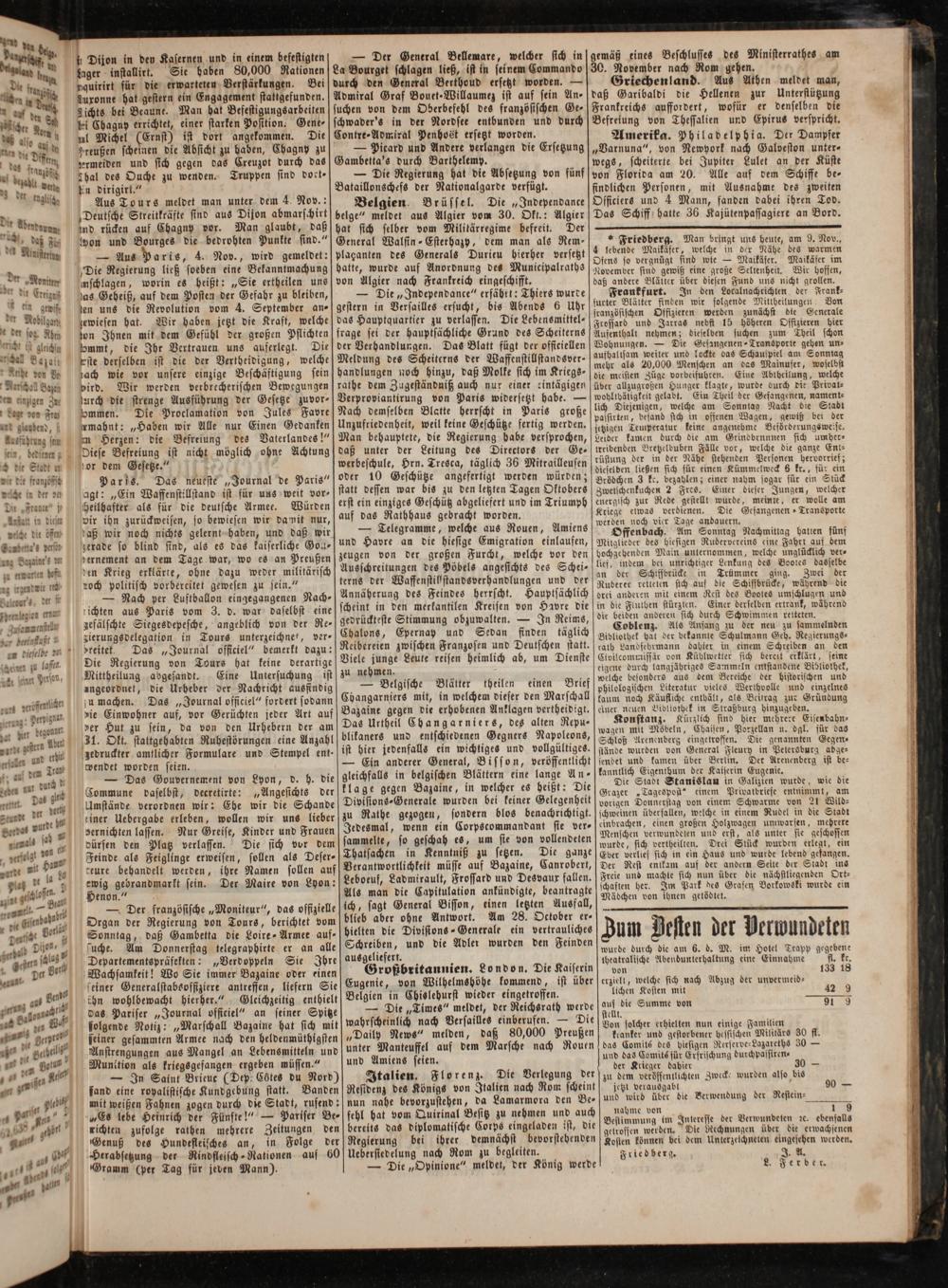 Aus Tours meldet man unter dem 4. Nov.: „Deutsche Streitkräfte sind aus Dijon abmarschirt ind rücken auf Chagny vor. Man glaubt, daß won und Bourges die bedrohten Punkte sind.“