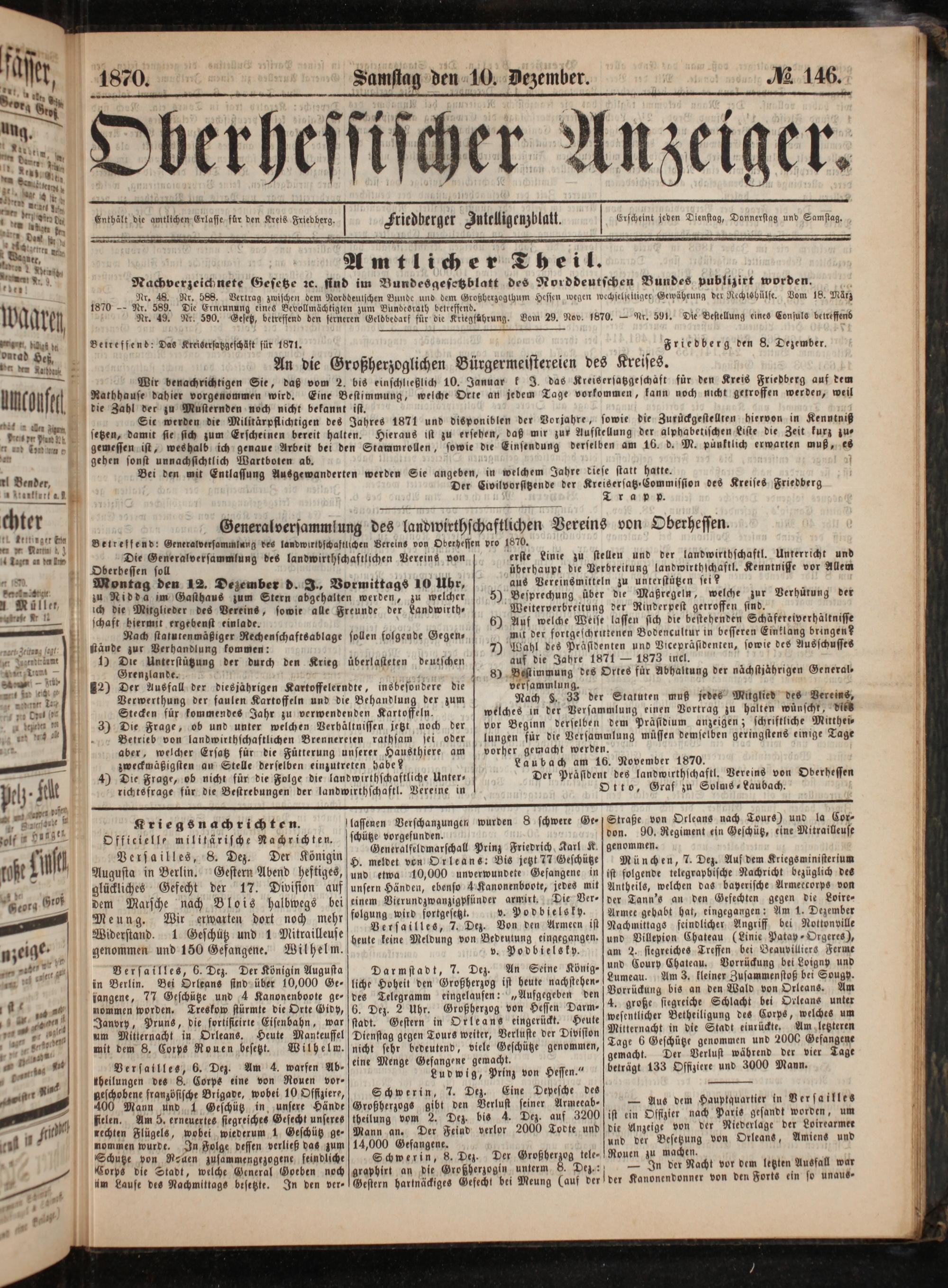 Die Generalversammlung des landwirthschaftlichen Vereins von Oberhessen soll Montag den 12. Dezember d. J., Vormittags 10 Uhr, zu Nidda im Gasthaus zum Stern abgehalten werden, zu welcher ich die Mitglieder des Vereins, sowie alle Freunde der Landwirth⸗ schaft hiermit ergebenst einlade. Nach statutenmäßiger Rechenschaftsablage sollen folgende Gegen— stände zur Verhandlung kommen: 1) Die Unterstützung der durch den Krieg überlasteten deutschen Grenzlande. N 8 2) Der Ausfall der diesjährigen Kartoffelerndte, insbesondere die Verwerthung der faulen Kartoffeln und die Behandlung der zum Stecken für kommendes Jahr zu verwendenden Kartoffeln. 3) Die Frage, ob und unter welchen Verhältnissen jetzt noch der Betrieb von landwirthschaftlichen Brennereien rathsam sei oder aber, welcher Ersatz für die Fütterung unserer Hausthiere am