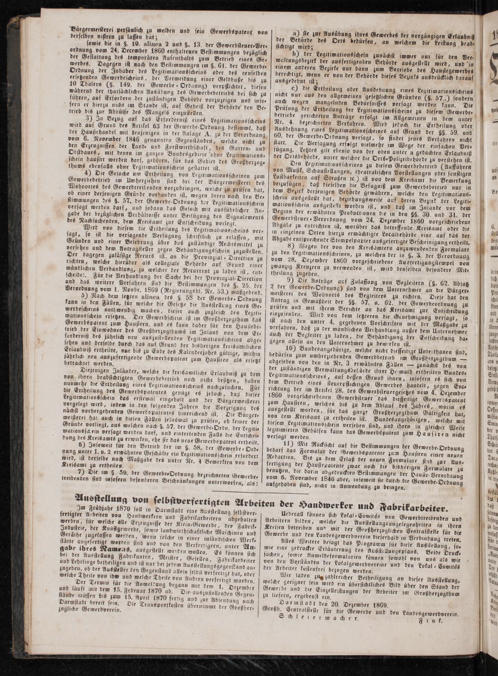 Im Frühjahr 1870 soll in Darmstadt eine Ausstellung selbstver— fertigter Arbeiten von Handwerkern und Fabrikarbeitern abgehalten werden, für welche alle Erzeugnisse der Klein⸗Gewerbe, der Fabrik⸗ Industrie, der Kunstgewerbe, sowie landwirthschaftliche Maschinen und Geräthe zugelassen werden, wenn solche in einer inländischen Werk, stätte angefertigt worden sind und von den Verfertigern, unter An⸗ gabe ihres Namens, ausgestellt werden wollen. Es koͤnnen sich bei der Aus stellung Fabrikanten, Meister, Gesellen, Fabrikarbeiter und Lehrlinge bethelligen und ist nur bei jedem Ausstellungsgegenstand an— zugeben, ob der Aussteller den Gegenstand allein selbst verfertigt hat, oder welche Theile von ihm und wesche Theile von Andern verfertigt wurden.