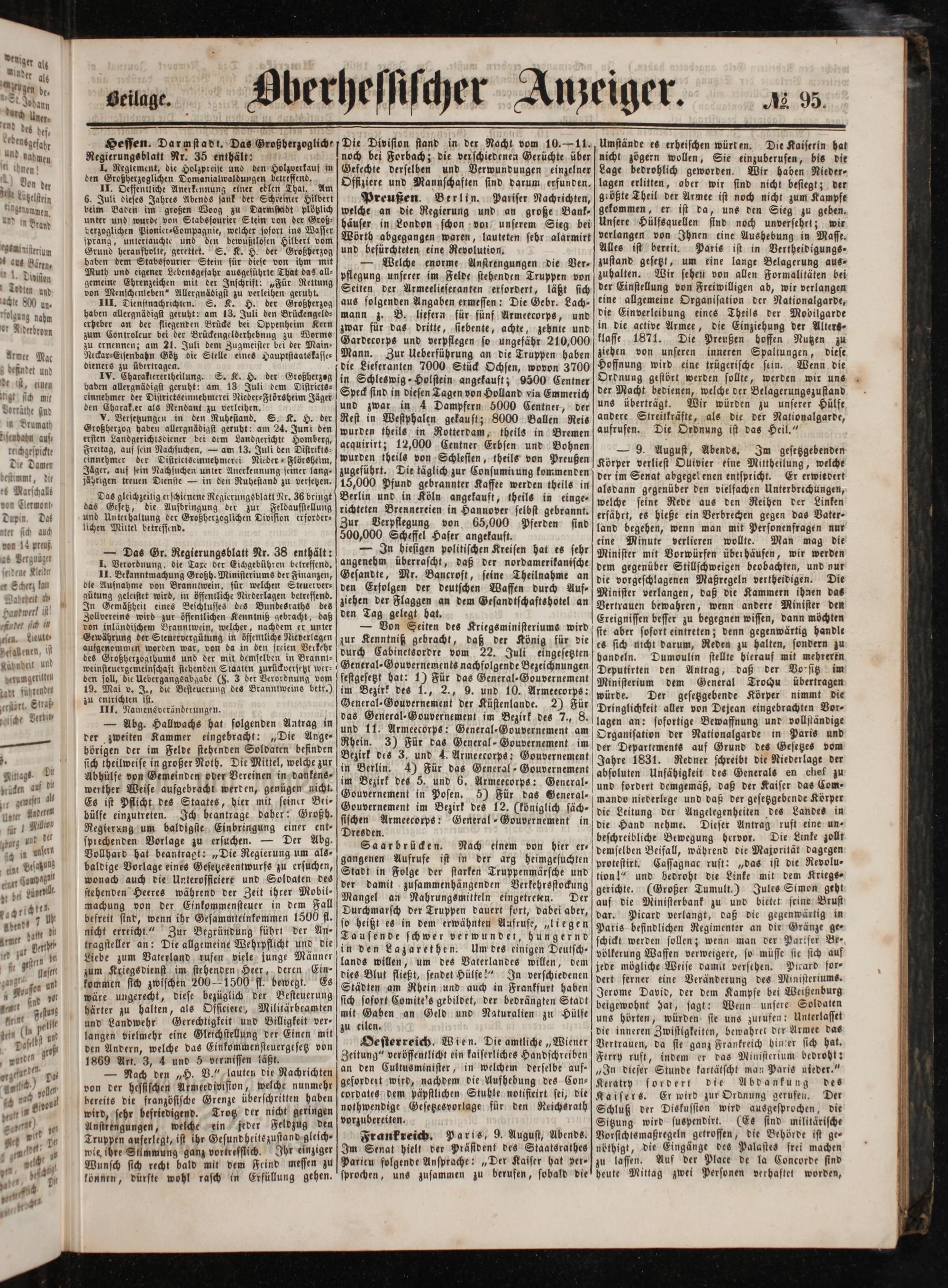 — Nach den„H. V.“ lauten die Nachrichten von der hessischen Armeedivision, welche nunmehr bereits die französische Grenze überschritten haben wird, sehr befriedigend. Trotz der nicht geringen Anstrengungen, welche ein jeder Feldzug den Truppen auferlegt, ist ihr Gesundheitszustand gleich- wie ihre Stimmung ganz vortrefflich. Ihr einziger Wunsch sich recht bald mit dem Feind messen zu können, dürfte wohl rasch in Erfüllung gehen.
