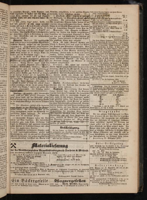 — Frankreich erklärt! Italien sei 71 der Kündigung des Septembervertrags zupor⸗ gekommen. Alle italienischen Städte flaggen. Alle europäischen Staaten lassen Italien in der römischen Frage vollkommen freie Hand. Unsere Armee ist auf 340,000 Mann gebracht. Garibaldi bot der französischen Republik seinen Arm an.