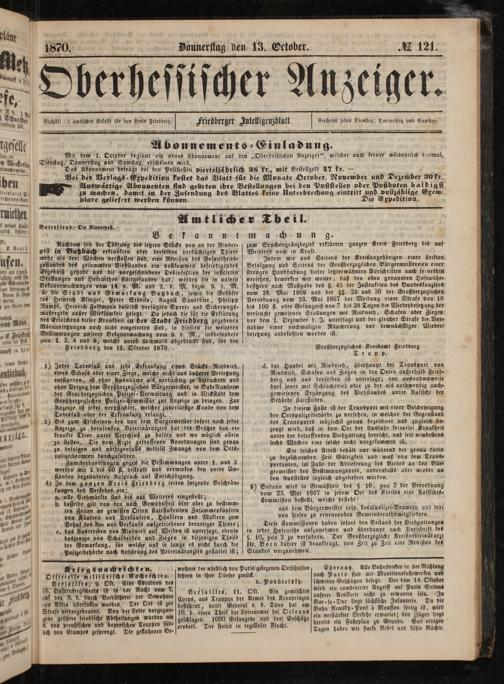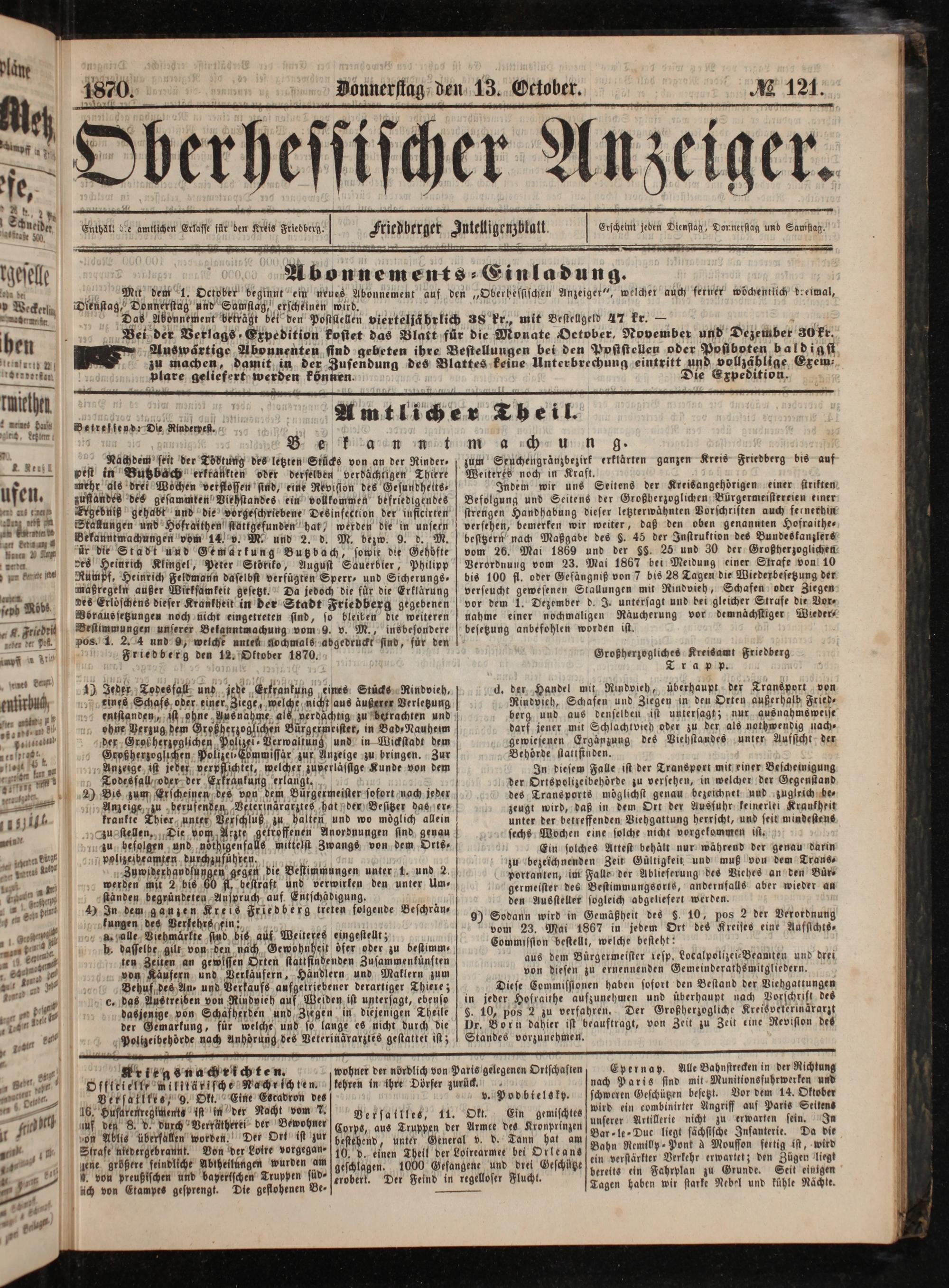 Mit dem 1. October beginnt ein neues Abonnement auf den„Oberhessischen Anzeiger“, welcher auch ferner wöchentlich dreimal,