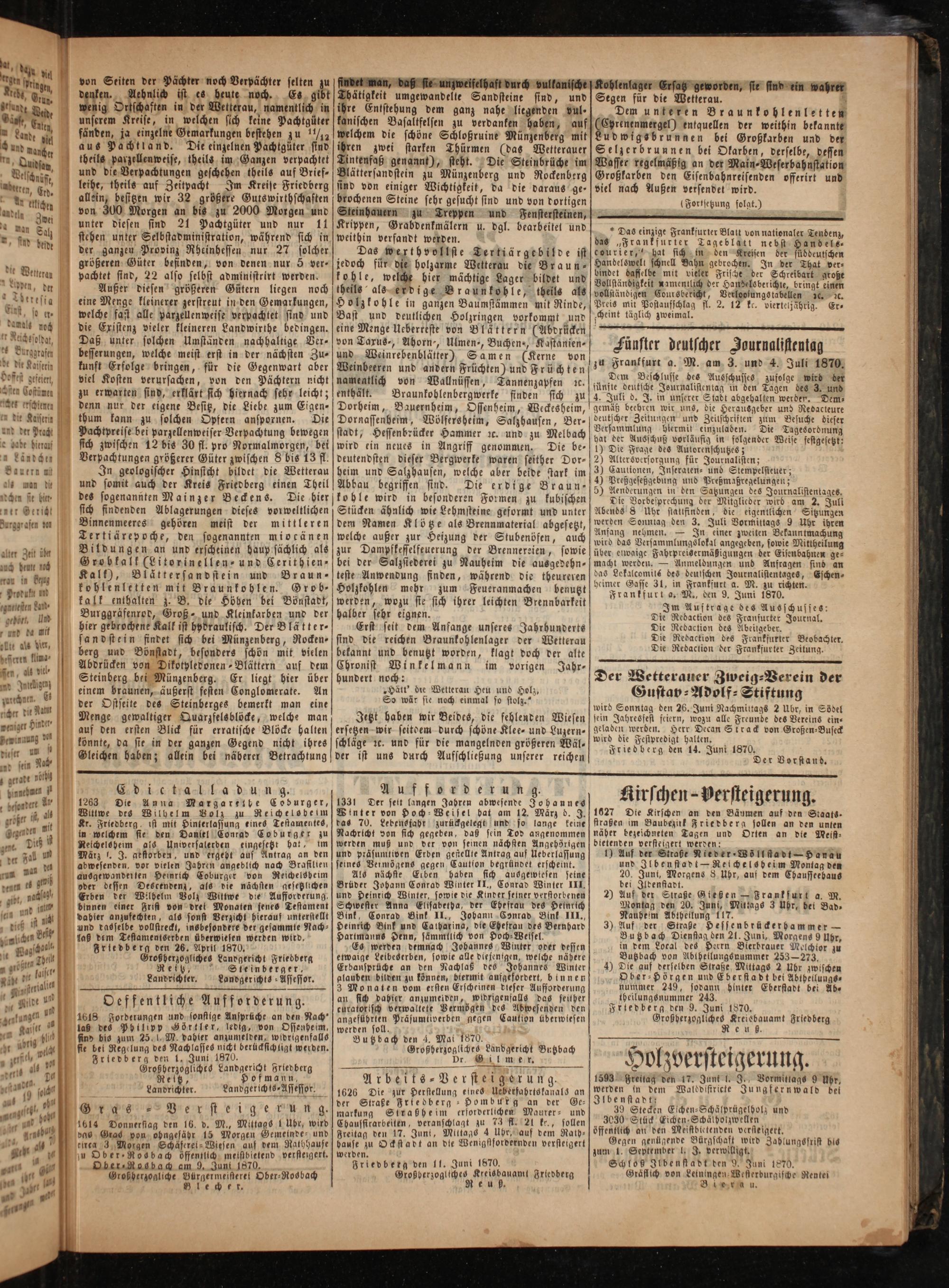 circa 3 Morgen Schäferel-Wiesen auf dem Rathhause zu Ober Rosbach öffentlich meistbietend versteigert. Ober Rosbach am 9. Juni 1870. Großherzogliche Bürgermeisteret Ober-Rosbach Blecher.