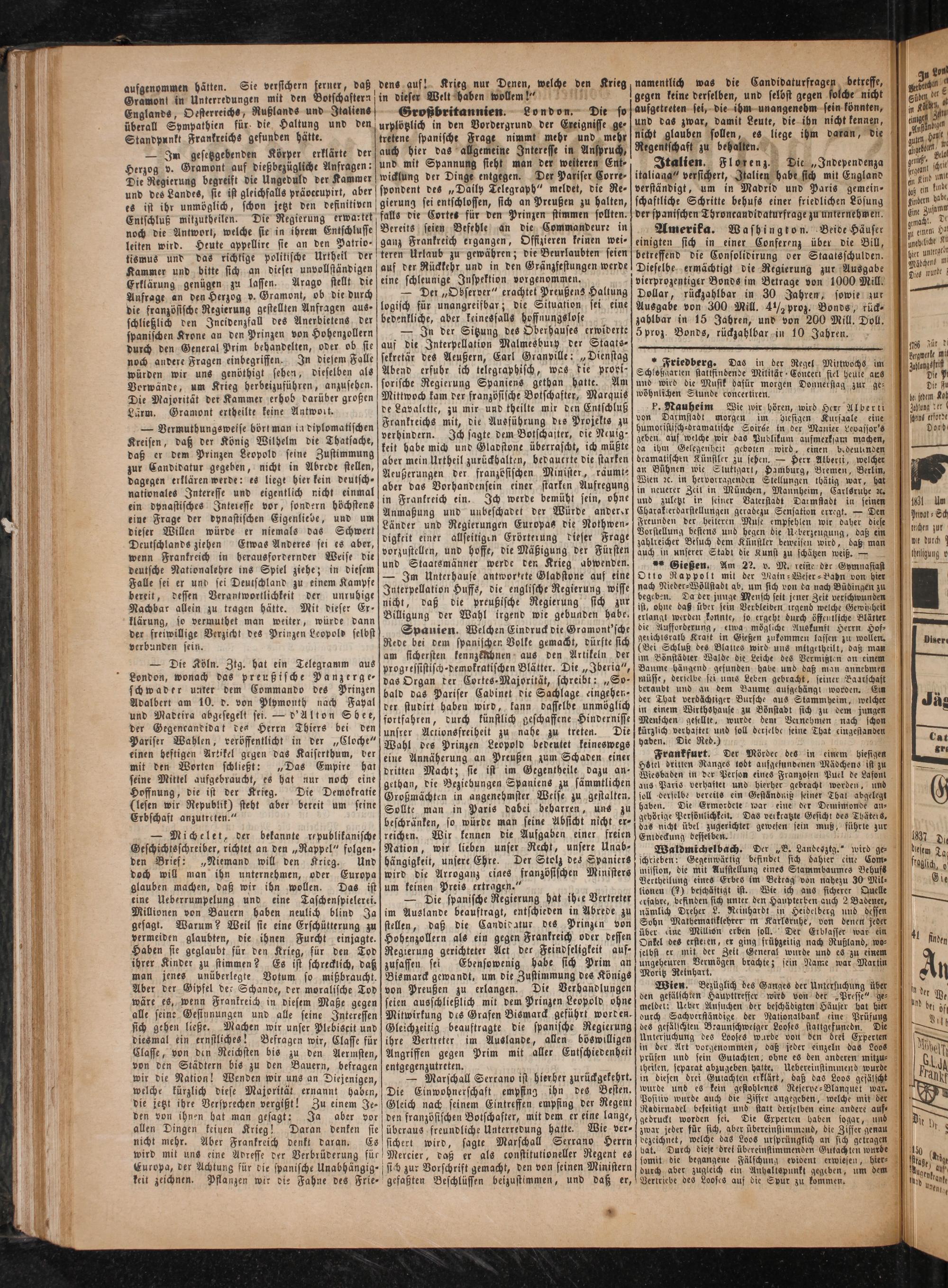 Großbritannien. London. Die so urplötzlich in den Vordergrund der Exeignisse ge⸗ tretene spanische Frage nimmt mehr und mehr auch hier das allgemeine Interesse in Anspruch, und mit Spannung sieht man der weiteren Ent⸗ wicklung der Dinge entgegen. Der Pariser Corre⸗ spondent des„Daily Telegraph“ meldet, die Re- gierung sei entschlossen, sich an Prtußen zu halten, falls die Cortes für den Prinzen stimmen sollten. Bereits seien Befehle an die Commandeure in ganz Frankreich ergangen, Offizieren keinen wei⸗ teren Urlaub zu gewähren; die Beurlaubten seien auf der Rückkehr und in den Gränzfestungen werde eine schleunige Inspektion vorgenommen.