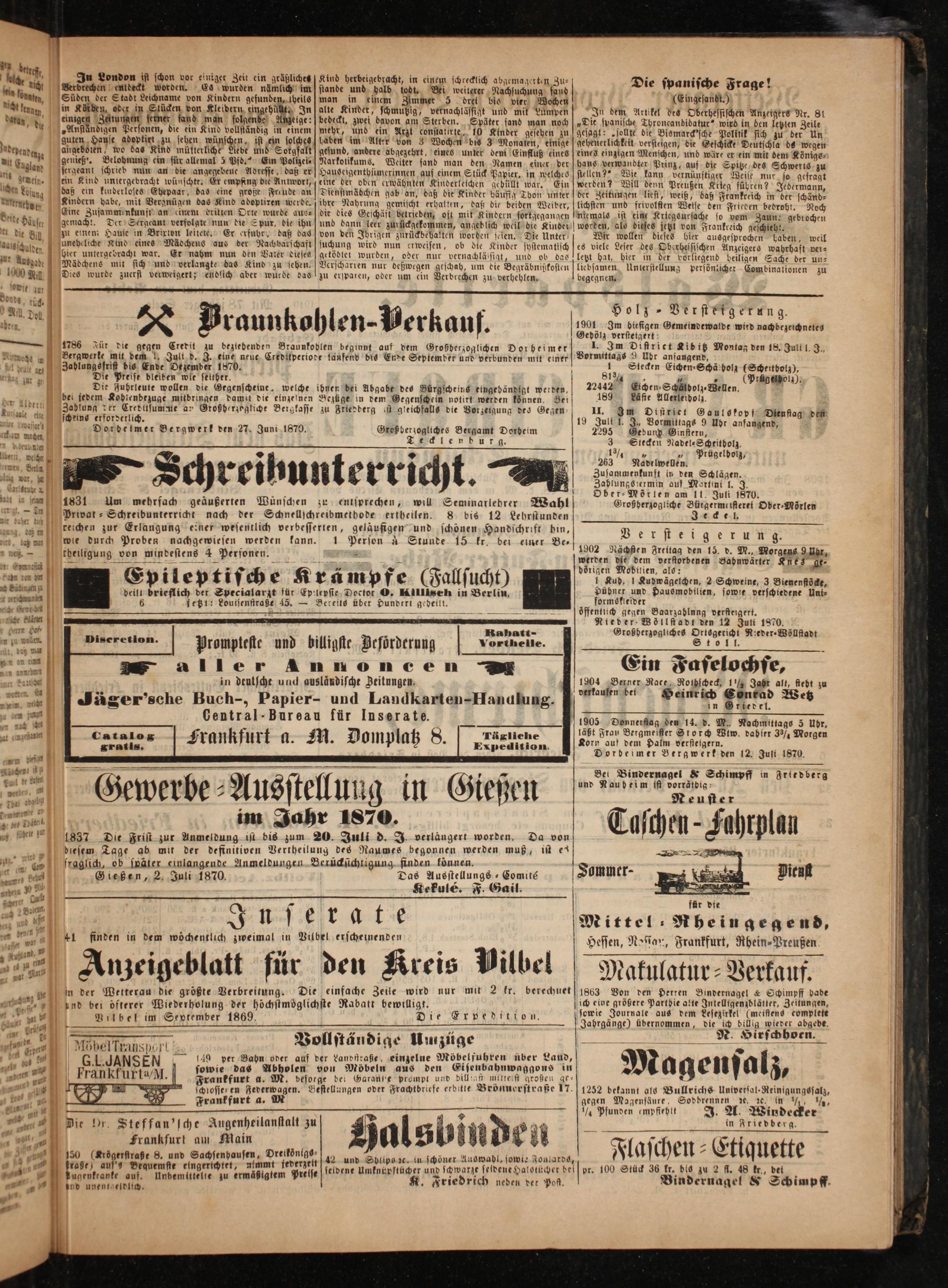 in der Wetterau die größte Verbreitung. Die einfache Zeile wird nur mit 2 kr. berechnet und bei öfterer Wiederholung der höchstmöglichste Rabatt bewilligt. Vilbel im September 1869. Die
