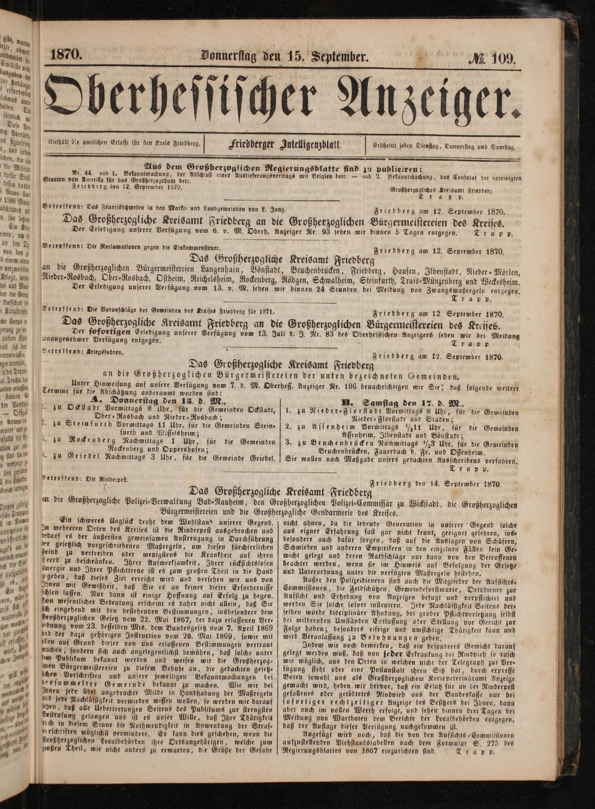 Indem wir noch bemerken, daß ein besonderes Gewicht darauf gelegt werden muß, daß von jeder Erkrankung bei Rindvieh so rasch wie möglich, aus den Orten in welchen nicht der Telegraph zur Ver— fügung steht oder eine Postanstalt ihren Sitz hat, durch expresse Boten sowohl uns als Großherzoglichem Kreieveterinaramt Anzeige gemacht wird, heben wir hervor, daß ein Ersatz für an der Rinderpest gefallenes oder getödtetes Rindvieh aus der Bundeskasse nur bei sofortiger rechtzeitiger Anzeige des Besstzers bei Ihnen, dann aber auch im vollen Werth erfolgt, und sehen binnen drei Tagen bei Meidung von Wartboten dem Berichte der Localbehoͤrden entgegen, daß der Auflage dieser Verfügung nachgekommen ist.