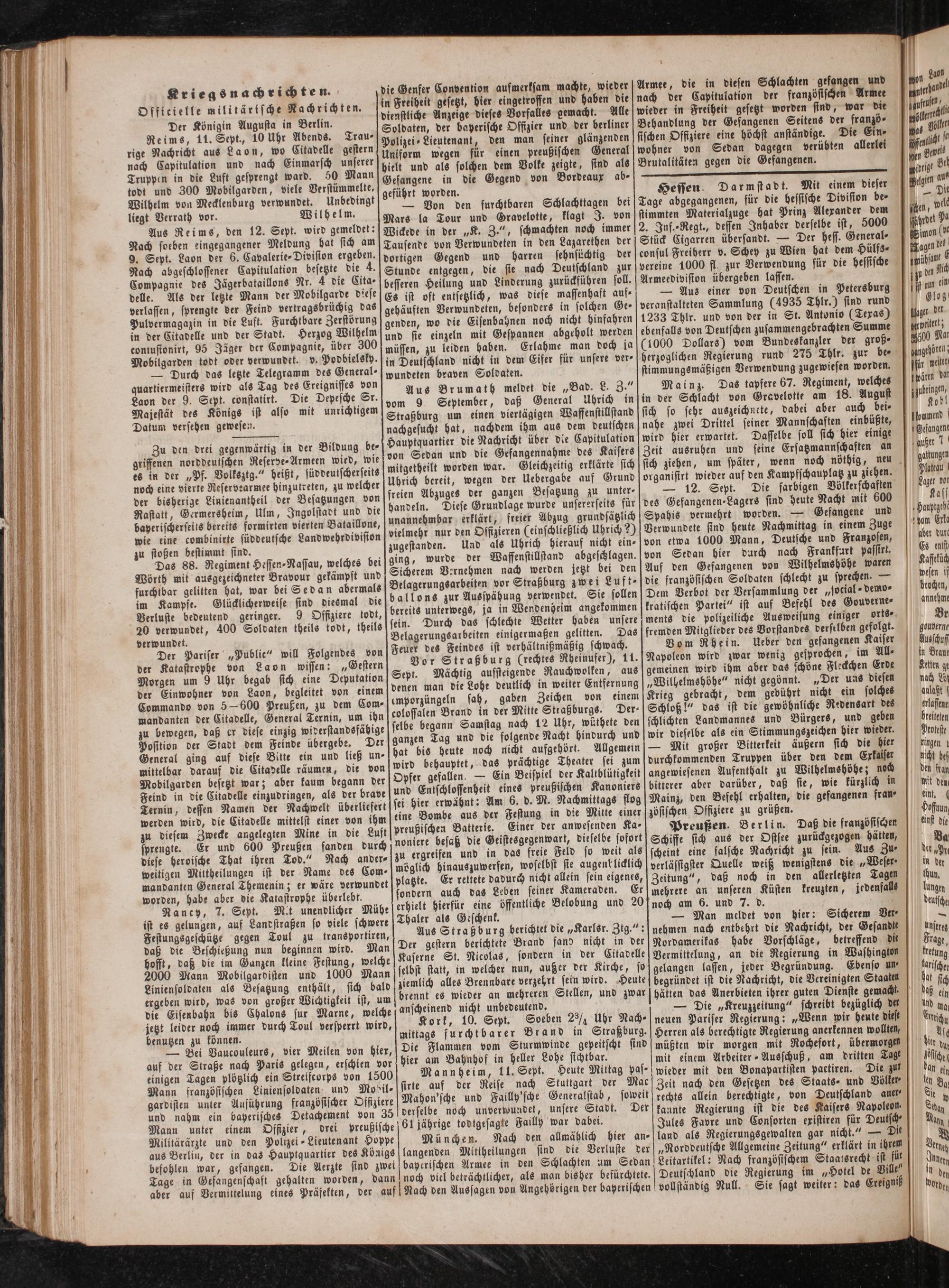 Aus Reims, den 12. Sept. wird gemeldet: Nach soeben eingegangener Meldung hat sich am 9. Sept. Laon der 6. Cavalerie⸗Division ergeben. Nach abgeschlossener Capitulation besetzte die Compagnie des Jägerbataillons Nr. 4 die Cita⸗ delle. Als der letzte Mann der Mobilgarde diese verlassen, sprengte der Feind vertragsbrüchig das Pulvermagazin in die Luft. Furchtbare Zerstörung in der Citadelle und der Stadt. Herzog Wilhelm contusionirt, 95 Jäger der Compagnie, über 300 Mobilgarden todt oder verwundet. v. Podbielsky.