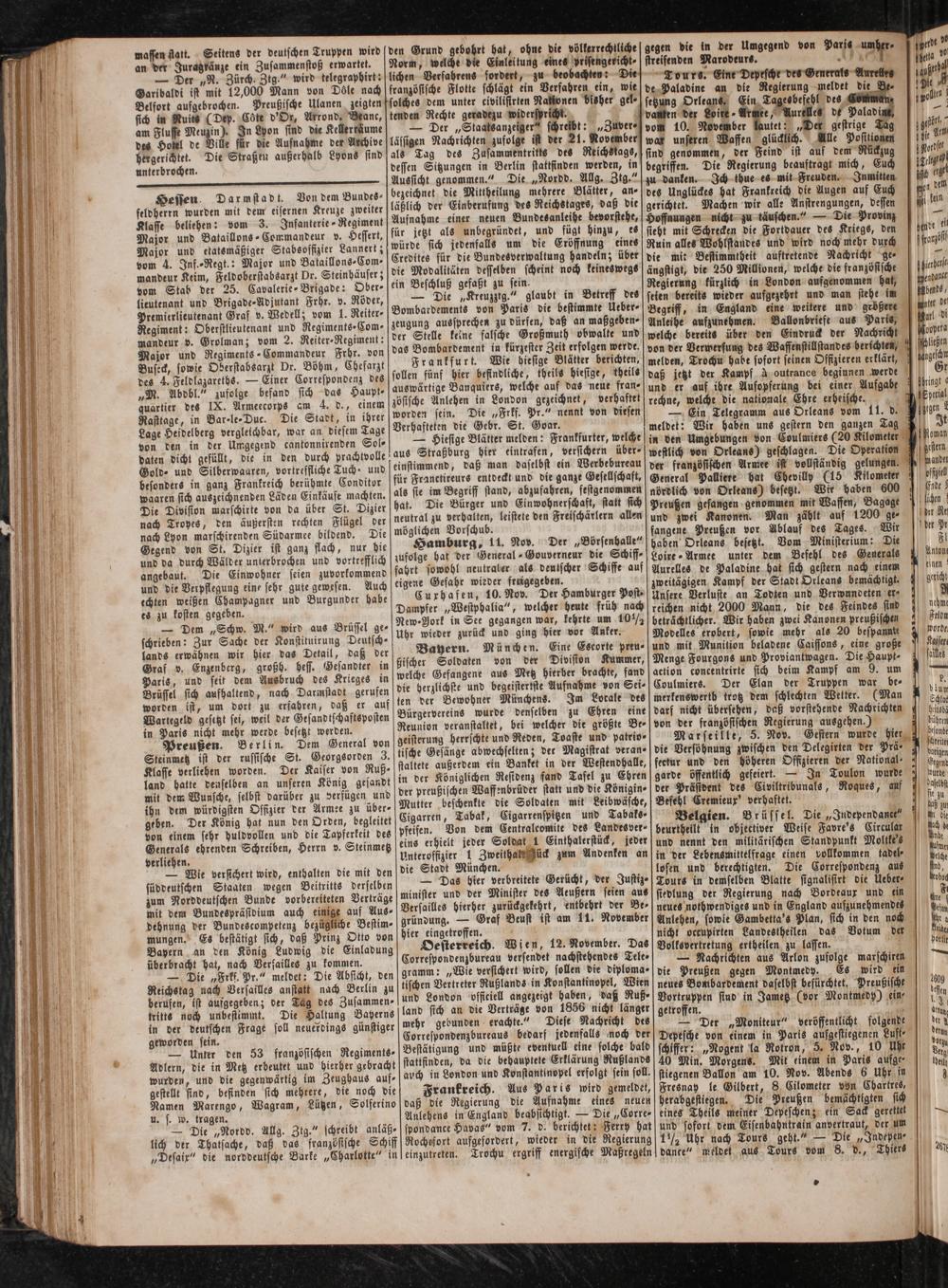 — Der„Moniteur“ veröffentlicht folgende Depesche von einem in Paris aufgestiegenen Luft⸗ schiffer:„Nogent la Rotron, 5. Nov., 10 Uhr 40 Min. Morgens. Mit einem in Paris aufge⸗ stiegenen Ballon am 10. Nov. Abends 6 Uhr in Fresnay le Gilbert, 8 Cilometer von Chartres, herabgestiegen. Die Preußen bemächtigten sich eines Theils meiner Depeschen; ein Sack gerettet und sofort dem Eisenbahntrain anvertraut, der um 1½ Uhr nach Tours geht.“— Die„Indepen⸗ dance“ meldet aus Tours vom 8. d., Thiers
