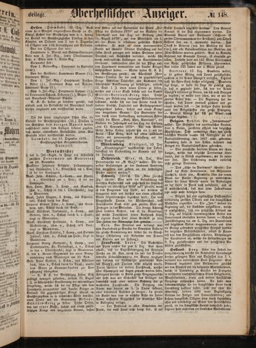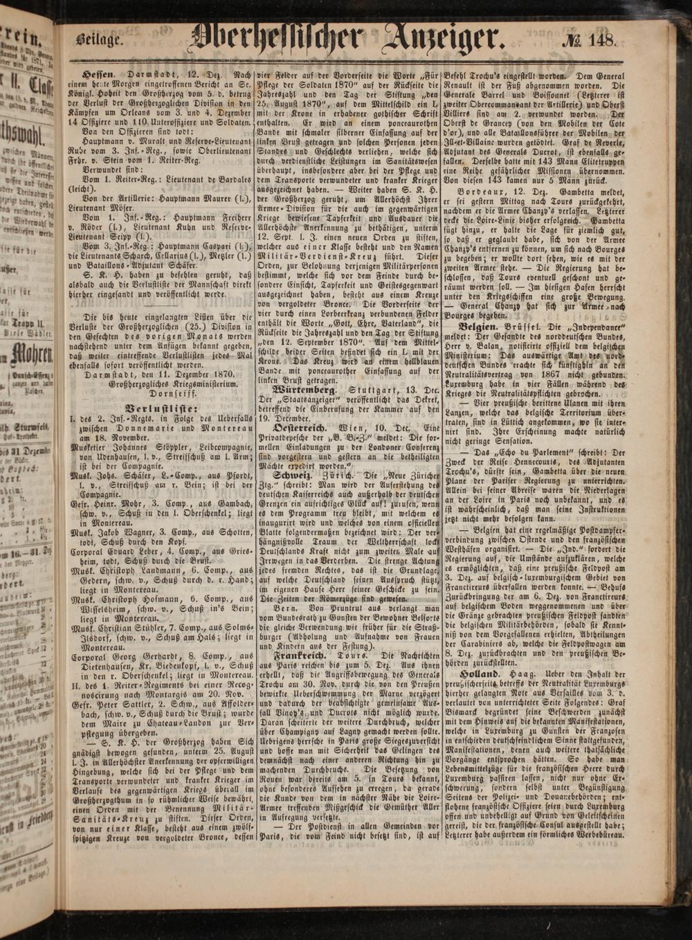 — Belgien hat eine regelmäßige Postdampfer⸗ verbindung zwischen Ostende und den französischen Westhäfen organisirt.— Die„Ind.“ fordert die Regierung auf, die Umstände aufzuklären, welche es ermöglichten, daß eine preußische Feldpost am 3. Dez. auf belgisch-luxemburgischem Gebiet von Franctireurs überfallen werden konnte.— Behufs Zurückbringung der am 6. Dez. von Franctireurs auf belgischem Boden weggenommenen und über die Gränze gebrachten preußischen Feldpost sandten die belgischen Militärbehörden, sobald sie Kennt⸗ niß von dem Vorgefallenen erhielten, Abtheilungen der Carabiniers ab, welche die Feldpostwagen am 8. Dez. zurückbrachten und den preußischen Be⸗ hörden zurückstellten.