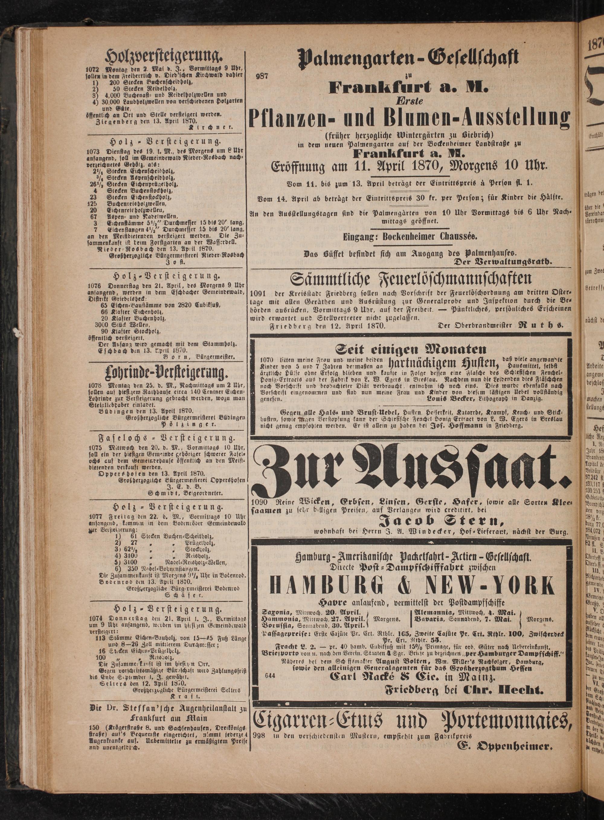 Frankfurt a. M. Eröffnung am 11. April 1870, Morgens 10 Uhr.