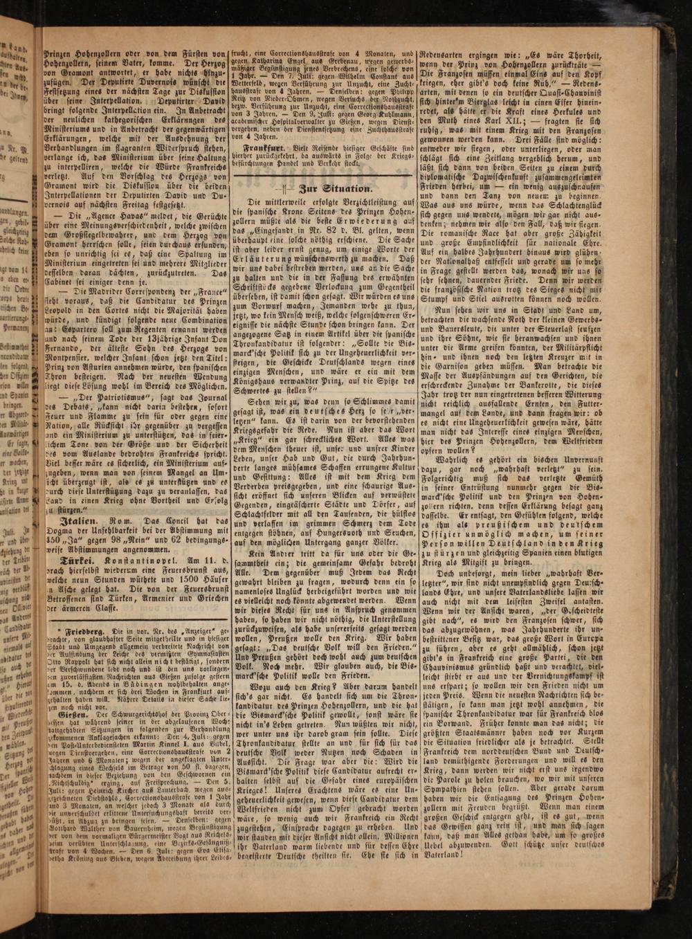 Nun sehen wir uns in Stadt und Land um, betrachten die wachsende Noth der kleinen Gewerbs— und Bauersleute, dit unter der Steuerlast seufzen und ihre Söhne, wie sie heranwachsen und ihnen unter die Arme greifen könnten, der Militärpflicht hin⸗ und ihnen noch den letzten Kreuzer mit in die Garnison geben müssen. Man betrachte die Masse der Auspfändungen auf den Gerichten, die erschreckende Zunahme der Bankerotte, die dieses Jahr trotz der nun eingetretenen besseren Witterung nicht reichlich ausfallende Ernten, den Futter- mangel auf dem Lande, und dann fragen wir: ob es nicht eine Ungeheuerlichkeit gewesen wäre, hätte man nicht das Interesse eines einzigen Menschen, hier des Prinzen Hohenzollern, dem Weltfrieden opfern wollen?