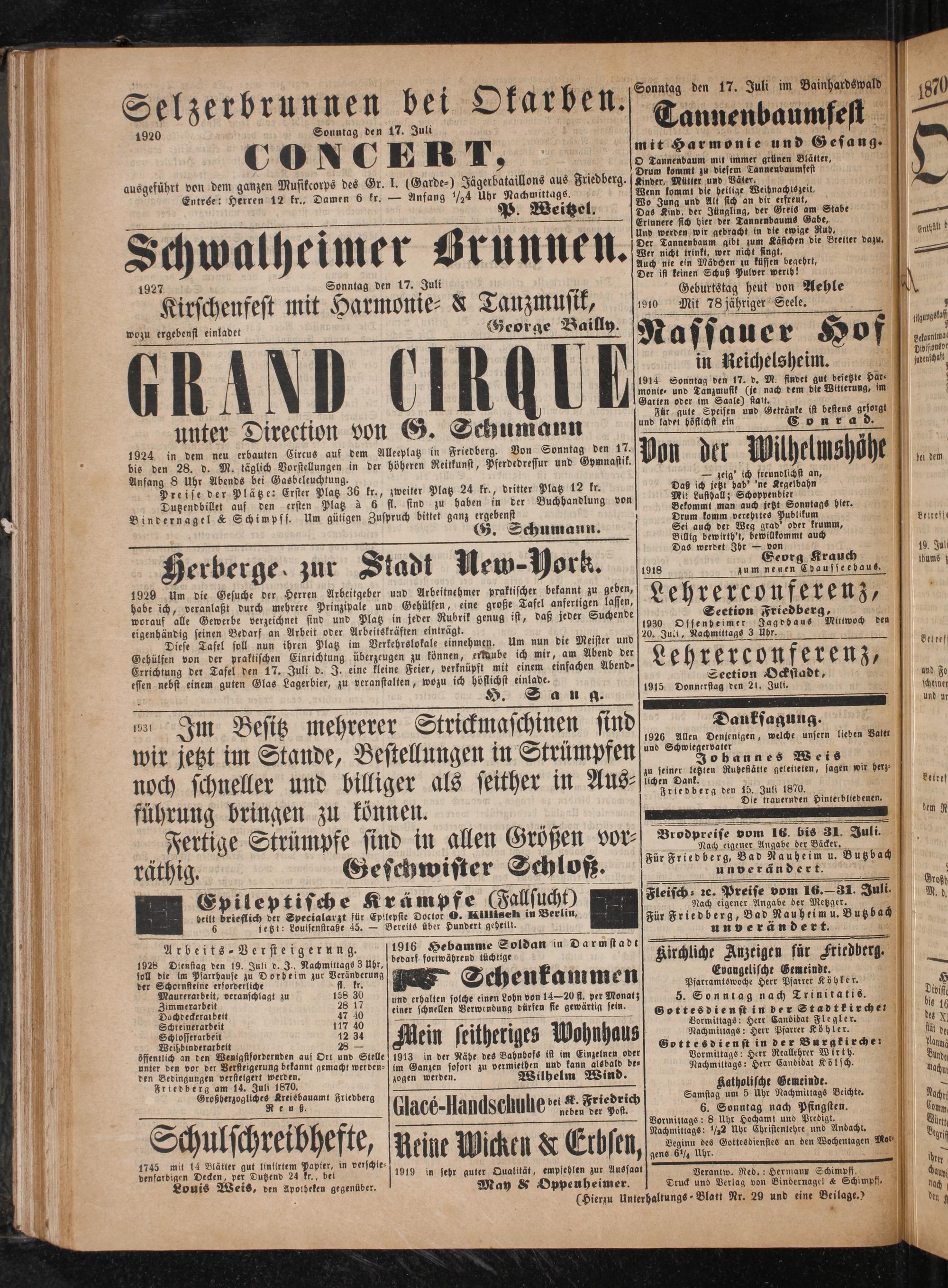 5 15 Tafel soll nun ihren Platz im Verkehrslokale einnehmen. Um nun die Meister und hBel ref ehülfen von der praktischen Einrichtung überzeugen zu können, erkaube ich mir, am Abend der h f Errichtung der Tafel den 17. Juli d. J. eine kleine Feier, verknüpft mit einem einfachen Abend⸗ 1 L re 10 b n L 1 E n 3 g essen nebst einem guten Glas Lagerbier, zu veranstalten, wozu ich höflichst einlade. 3 e 7 0. 5 2 onnerstag den 21. Juli. sheiner 5 H. Sang. inn u 5 2 5 9 N 1 l n Im Besitz mehrerer Strickmaschinen sind Danksagung. 1 f 7 t 7 St d B 1 l 5 S 5 8 eh 3 welche unsern lieben Vater un ervater wir jetzt im Stande, Bestellungen in Strümpfen gehen es se 4 N 4 zu seiner lezten Ruheftätte geleiieten, sagen wir herz. noch schneller und billiger als seither in Aus- tag er e * 4 5 Friedberg den 90 Juli 8055 Fuat se trauernden Hinterbliebenen. führung bringen zu können. 1 Fertige Strümpfe sind in allen Größen vor⸗ Bredel n erden A 544 8 N 1 Für Friedberg, Bad Nauheim u. Butzbach räthig. Geschwister Schloß. unverändert. 1 1 b 0 3 2 7 5 RN 5„ro 2 Epileptische Krämpfe(Fallsucht) Sielsch ac be lane eee. bellt brieflich der Specialarzt für Epilepste Doctor G. Hillisen in Berlin, Für Friedberg Bad Nauheim u. Butzbach 1 2 6 letzt: Loussenstraße 45.— Berelts über Hundert geheilt.. 1 3 er ändert. rbeits-Versteigerung. 1916 Hebamme Soldan in Darmstadt 5 5 N 1 b e be ee e 3 Uhr, bedarf foriwäbhrend lücunge Kirchliche Anzeigen für Friedberg. a oll die im i a g j 1 12 See dee n du 88 nen e Schenkammen enge be, Sia te, Maurerarbeit, veranschlagt zu 158 30 ö 0 8 10 8 J Di 0 Zimmerarbeit 28 17 und erhalten solche einen Lohn von 14— 20 fl. per Monat; 5. Sonntag nach Trinitatis. 1 iste Saeed 1% FFCFCCCFVFCCC aan gen Lasten 1 0 0 t 5 7 2 Vormittags: Herr Candidat Flegler. 1 X See enen* Mein seitheriges Wohnhaus wants err Per ben:: a öffenllich an den Wenigstsorvernden auf Ort und Stelle 1913 in der Nähe des Bahnbofs ist im Einzelnen oder Sa 5 882 Naar 28171 a dum unter den vor der Versseigerung bekannt gemacht werden⸗ im Ganzen sofort zu vermietten und kann alsbald be⸗ Nachmitta 6: Herr Candidat Kölsch. 5 Dunde den Bedingungen verfsetgert werden. zogen werden. Wilhelm Wind 96 5 5 Machu 2 e. a Katholische Gemeindt. 8 r zogliche iebauamt Friedberg 3 Samstag um 5 Uhr Nachmittags Beichte. ̃ bei K. Friedri imstag ür Nachmittags Beich N 2 Glacé-Handschuhe eu Fei 17 5 6. Sonntag nach Pfingsten. 1 dann S. ib t. ene 1 Kehrin 1010 Fun bat 785 Wirt 2 1 achmittags: ¼ Ahr ristenlehre un ndacht. N 1 schrei hef E, Reine 1 ch N Erb el Beginn des Gottesdienstes an den Wochentagen gif s 6¼ Uh— 1745 mit 14 Blätter gut linfirtem Papter, in verschie⸗ a 9 8 IIe.. 2 ihre denfarbigen Decken per Dutzend 24 kr., bet 1919 in sehr guter Qualität, empfehlen zur Aussaat Verantw. Red.: Hermann Schimpff. 15 Louis Weis, den Apotheken gegenüber. May& Oppenheimer. Druck und Verlag von Bindernagel& Schimp 17 N(Hierzu Unterhaltungs Blatt Nr. 29 und eine Beilage.) den