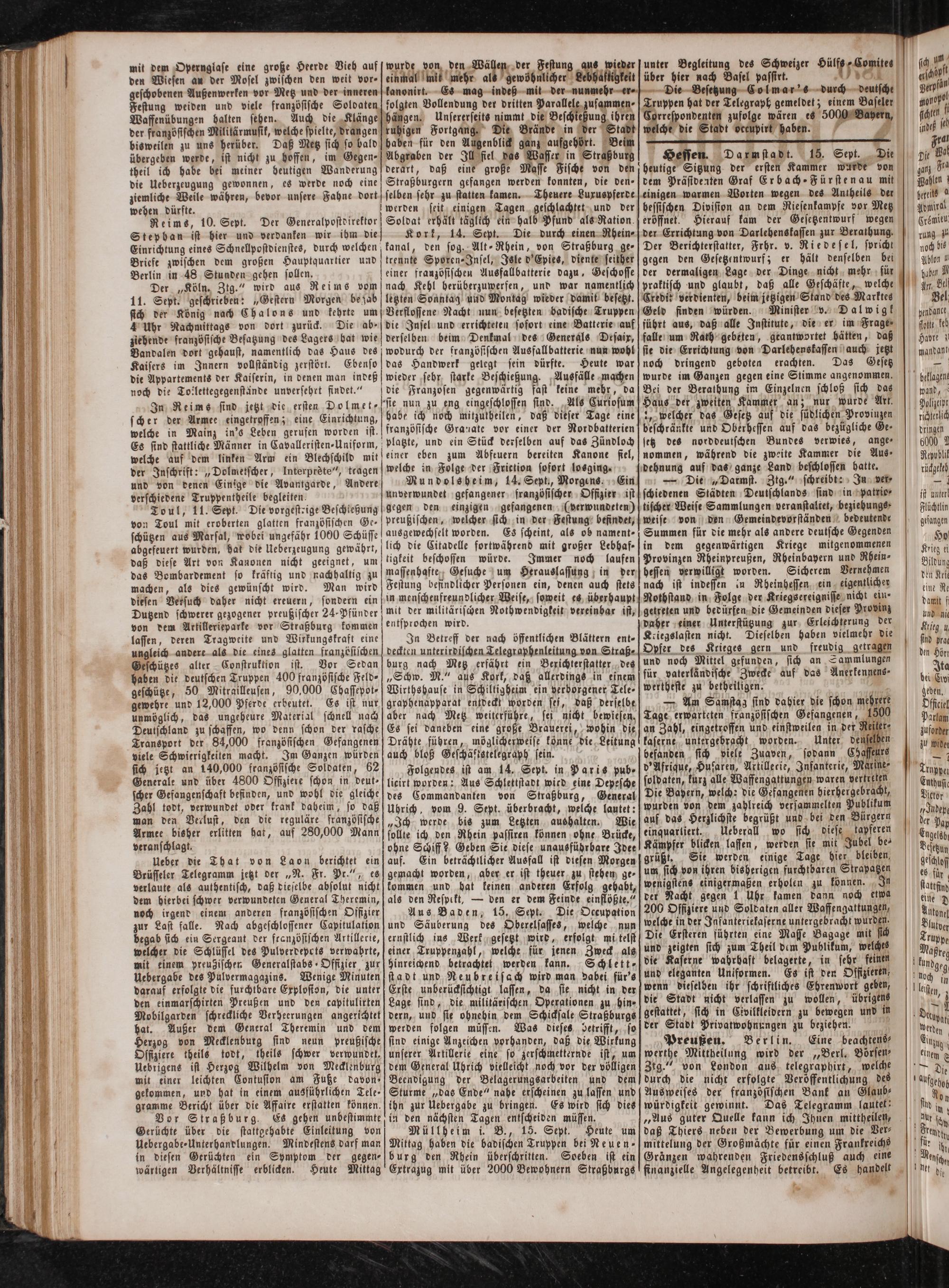 Mundolsheim, 14. Sept., Morgens. Ein un verwundet gefangener französischer Offizier ist gegen den einzigen gefangenen(verwundeten) preußischen, welcher sich in der Festung befindet, ausgewechselt worden. Es scheint, als ob nament- lich die Citadelle fortwährend mit großer Lebhaf— tigkeit beschossen würde. Immer noch laufen massenhafte Gesuche um Herauslassung in der Festung befindlicher Personen ein, denen auch stets in menschenfreundlicher Weise, soweit es überhaupt mit der militärischen Nothwendigkeit vereinbar ist, entsprochen wird.