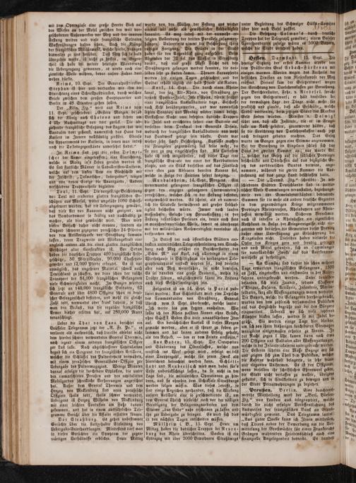 ohne Schiff? Geben Sie diese unausführbare Idee auf. Ein beträchtlicher Ausfall ist diesen Morgen gemacht worden, aber er ist theuer zu stehen ge⸗ kommen und hat keinen anderen Erfolg gehabt, als den Respekt,— den er dem Feinde einflößte.“ Aus Baden, 15. Sept. Die Occupation und Säuberung des Oberelsasses, welche nun ernstlich ins Werk gesetzt wird, erfolgt mi telst einer Truppenzahl, welche für jenen Zweck als hinreichend betrachtet werden kann. Schlett⸗ stadt und Neubreisach wird man dabei für's Erste unberücksichtigt lassen, da sie nicht in der Lage sind, die militärischen Operationen zu hin⸗ dern, und sie ohnehin dem Schicksale Straßburgs werden folgen müssen. Was dieses betrifft, so sind einige Anzeichen vorhanden, daß die Wirkung unserer Artillerie eine so zerschmetternde ist, um dem General Uhrich vielleicht noch vor der völligen Beendigung der Belagerungsarbeiten und dem Sturme„das Ende“ nahe etscheinen zu lassen und ihn zur Uebergabe zu bringen. Es wird sich dies in den nächsten Tagen entscheiden müssen. Müllheim i. B., 15. Sept. Heute um Mittag haben die badischen Truppen bei Neuen⸗ burg den Rhein überschritten. Soeben ist ein