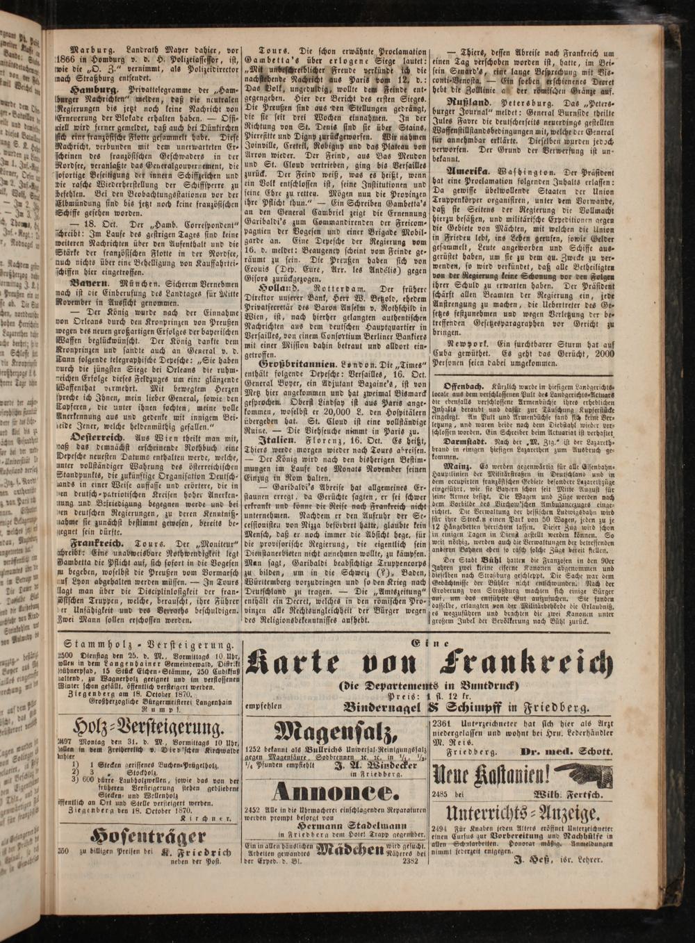 Frankreich. Tours. Der„Moniteur“ ihreibt: Eine unabweisbare Nothwendigkeit legt Bambetta die Pflicht auf, sich sofort in die Vogesen u begeben, woselbst die Preußen vom Vormarsch auf Lyon abgehalten werden müssen.— In Tours lagt man über die Disciplinlosigkeit der fran—