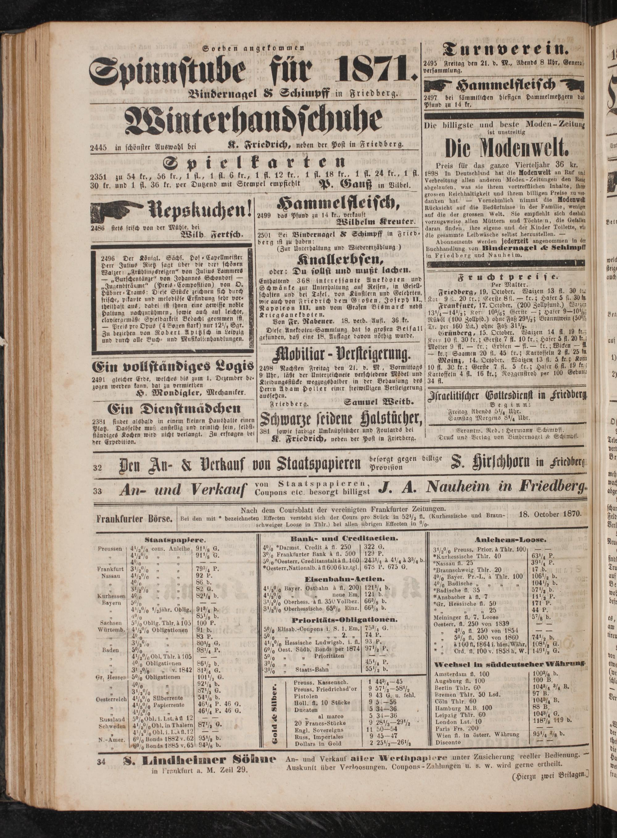 2445 in schönster Auswahl bei K. Friedrich, neben der Post in Friedberg. Spielkarten 2351 zu 54 kr., 56 kr., 1 fl., 1 fl. 6 kr., 1 fl. 12 kr., 1 N., N en