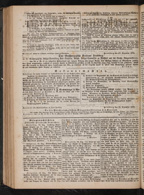 Kriegsnachrichten. Offieielle militärische Nachrichten. Versailles, 15. Dez. Diesseitige Abthei⸗ lungen besetzten am 11. nach kurzem Gefechte Beaumont, westlich von Eoreux. Der vor La Fere erschienene Feind hat den Rückzug angetreten. n der Verfolgung des Feindes bis Oucques „(Dep. Loir et Cher, Arr. Blois) und Maves ebendaselbst) hat die Armee⸗ Abtheilung des Broßberzogs von Mecklenburg am 13. 2000 feind⸗ liche Marodeurs gesammelt. v. Podbielsky.
