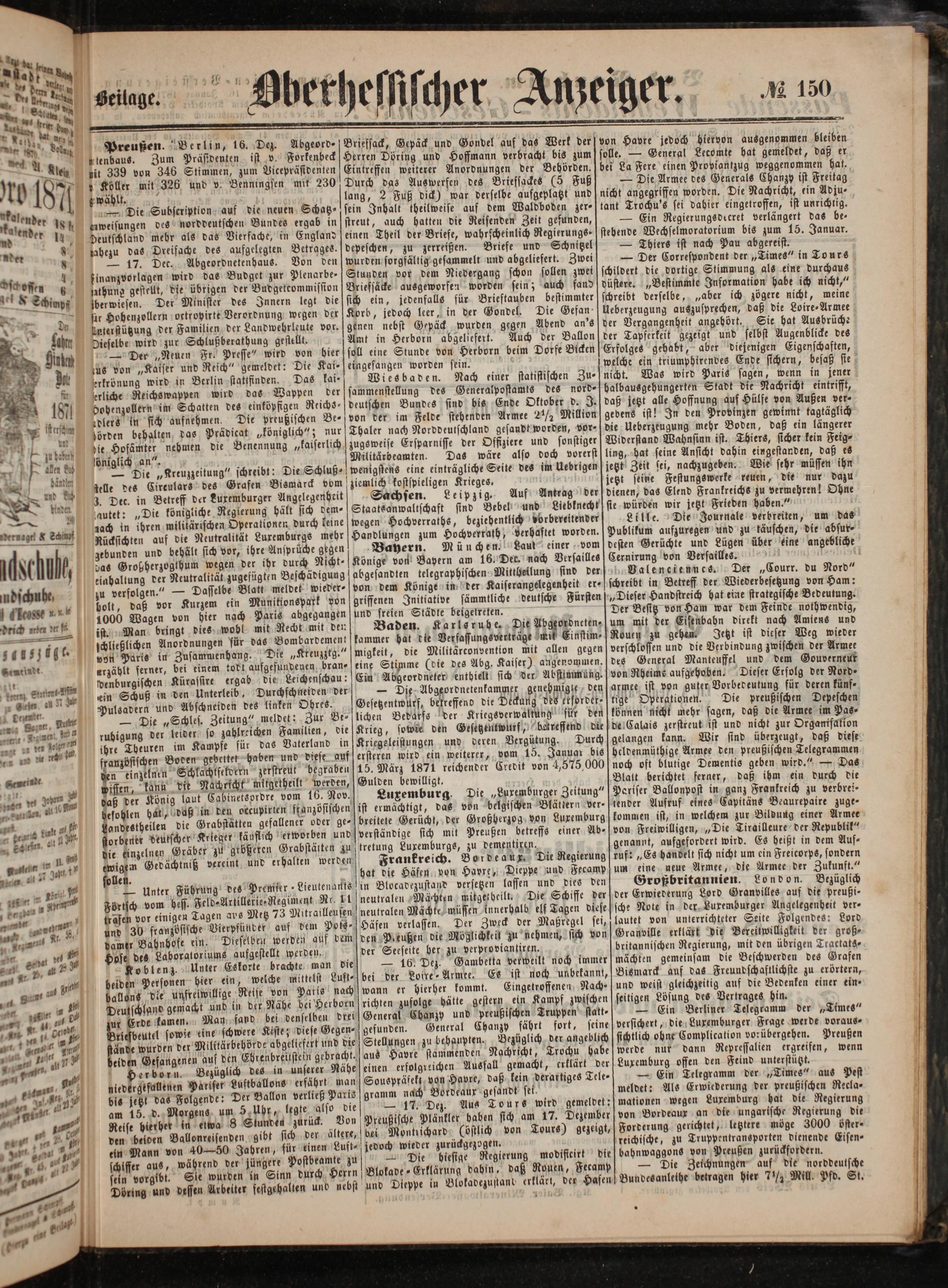 3. Dec. in Betreff der Luxemburger Angelegenheit autet:„Die königliche Regierung hält sich dem⸗ lach in ihren milikärischen Operationen durch keine Rücksichten auf die Neutralität Luxemburgs mehr zebunden und behält sich vor, ihre Ansprüche gegen Großherzogthum wegen der ihr durch Nicht; einhaltung der Neutralität zugefügten Beschädigung zu verfolgen.“— Dasselbe Blatt meldet wieder Kurzem ein Munitionspark von Wagen von hier nach Paris abgegangen ist. Man bringt dies wobl mit Recht mit den schließlichen Anordnungen für das Bombardement Die„Kreuzztg. tobt aufgefundenen bran⸗ ergab die Leichenschau: Durchschneiden der
