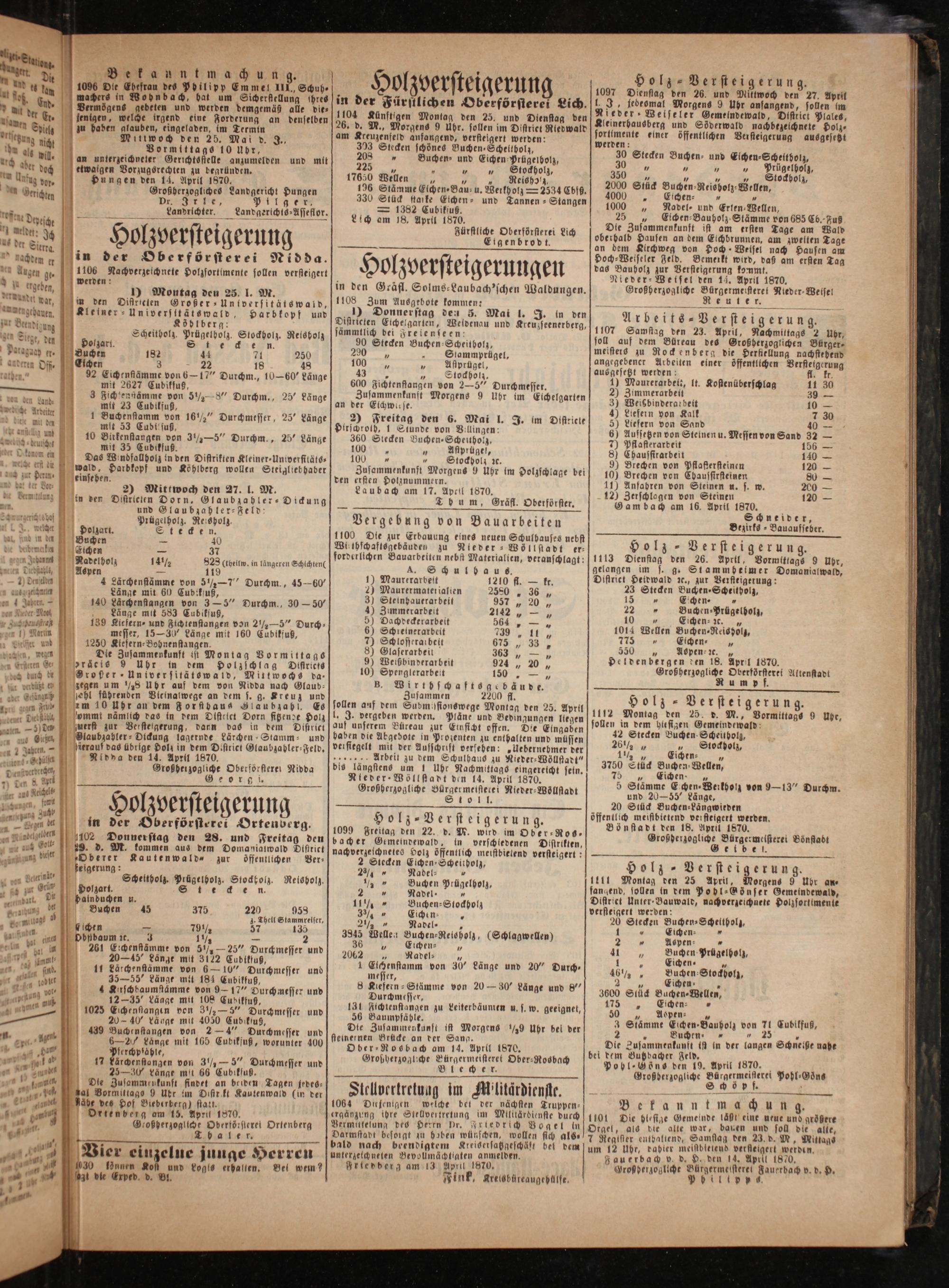 in den Geäfl. Solms Laubach'schen Waldungen. 1108 Zum Ausgebote kommen: 1) Donnerstag den 5. Mai l. J. in den