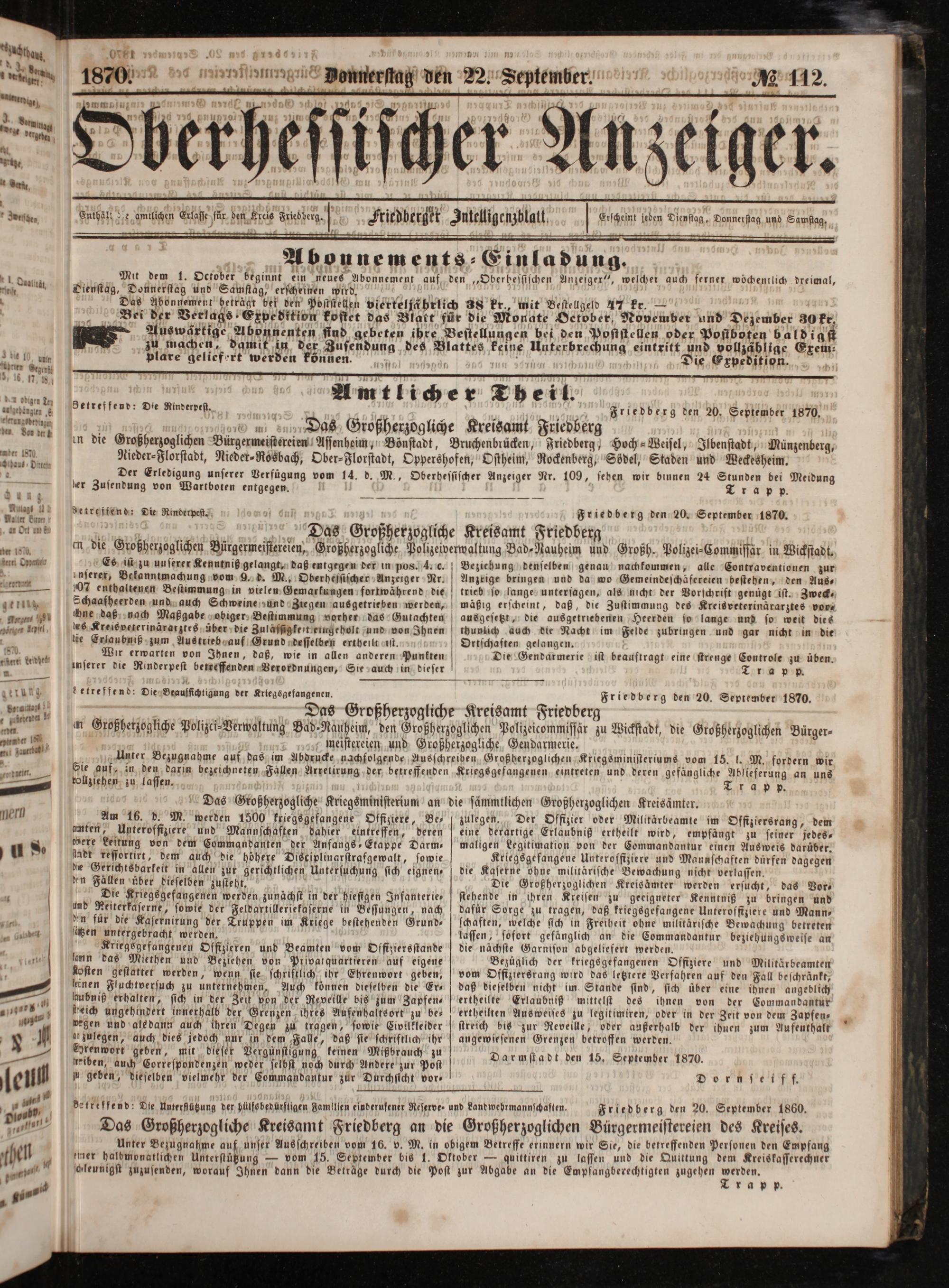 1— Auswärtige Abonnenten find gebeten ihre Bestellungen bei den Posistellen oder Posiboten baldigst zu machen, damit in der Zusendung des Blattes keine Unterbrechung eintritt und vollzählige Exem⸗ plare geliefert werden können. 105 55 1 Die Expedition. f Amtlicher Theil. Zetreffend: Die Rinderpest. a Friedberg den 20. September 1870.