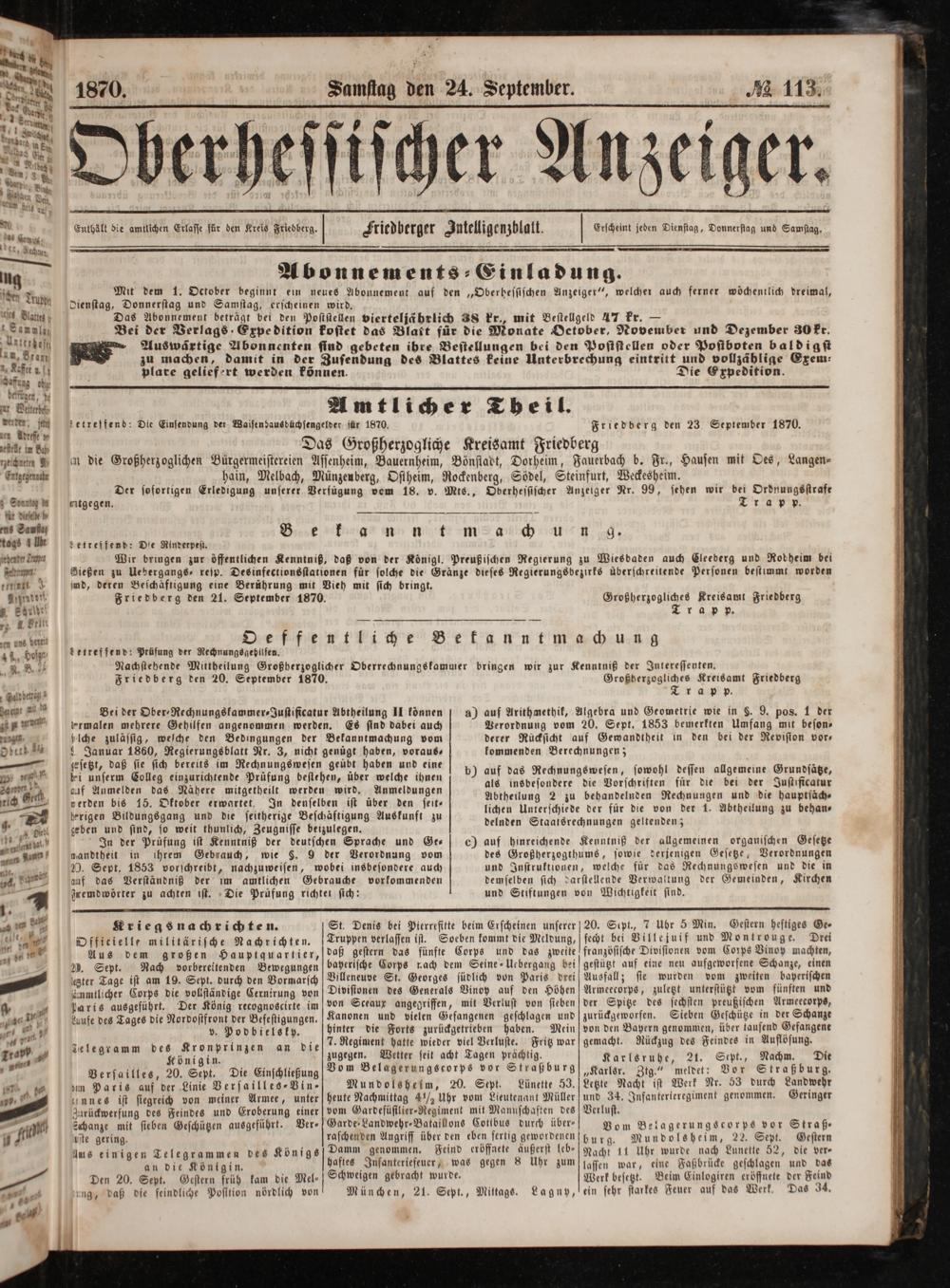 Mit dem 1. October beginnt ein neues Abonnement auf den„Oberhessischen Anzeiger“, welcher auch ferner wöchentlich dreimal,