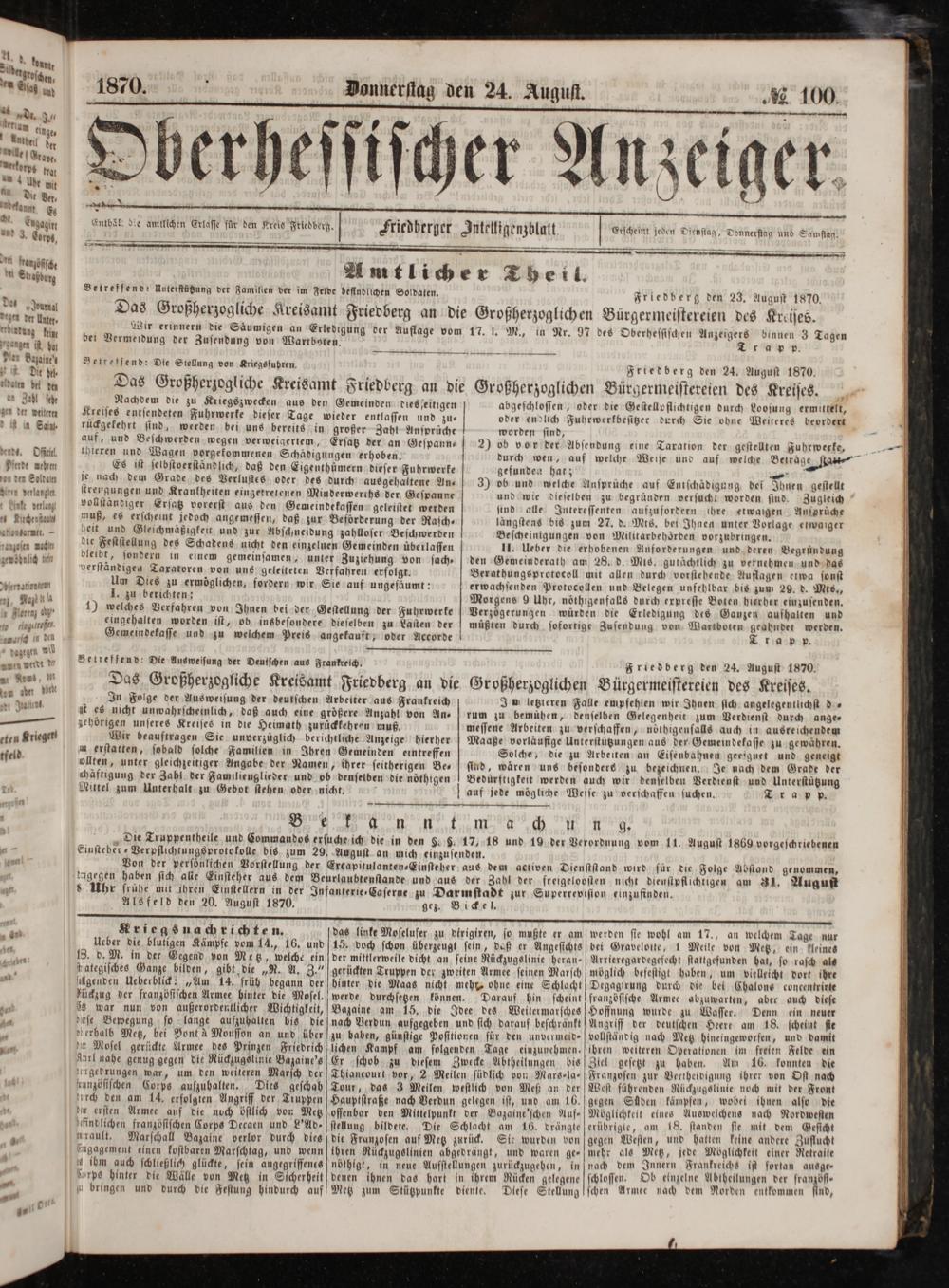Friedberg den 24. August 1870. Großherzoglichen Bürgermeistereien des Kreises.