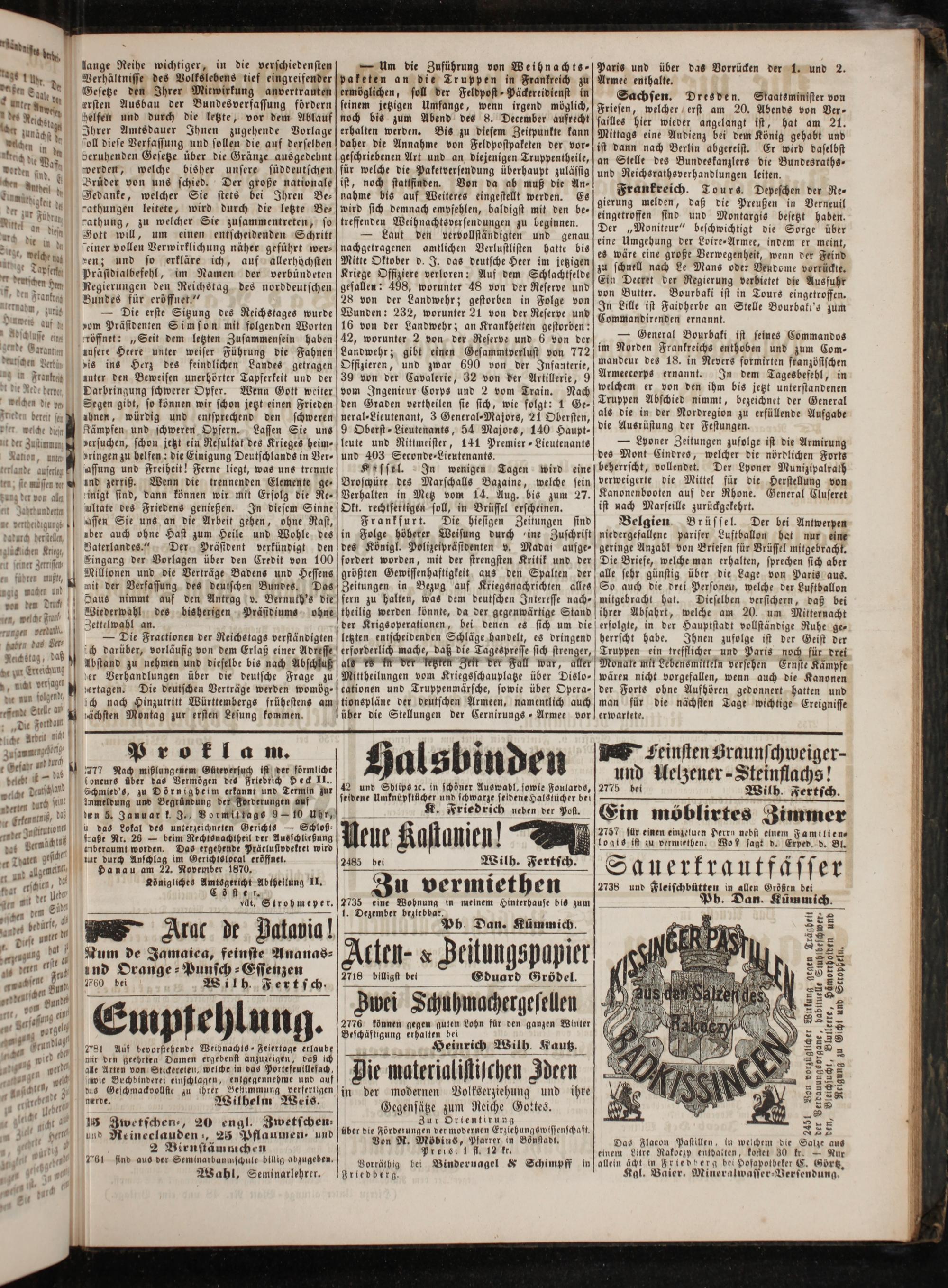 Frankfurt. Die hiesigen Zeitungen sind in Folge höherer Weisung durch eine Zuschrift des Königl. Polizeipräsidenten v. Madai aufge⸗ fordert worden, mit der strengsten Kritik und der größten Gewissenhaftigkeit aus den Spalten der Zeitungen in Bezug auf Kriegsnachrichten alles fern zu halten, was dem deutschen Interesse nach- theilig werden könnte, da der gegenwärtige Stand der Krigsoperationen, bei denen es sich um die letzten entscheidenden Schläge handelt, es dringend erforderlich mache, daß die Tagespresse sich strenger, als es kn der fetzren Zeft der Fall war, aller Mittheilungen vom Kriegsschauplatze über Dislo— cationen und Truppenmärsche, sowie über Opera- tionspläne der deutschen Armeen, namentlich auch über die Stellungen der Cernirungs- Armee vor
