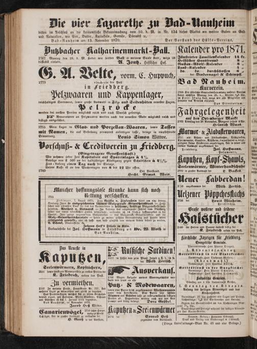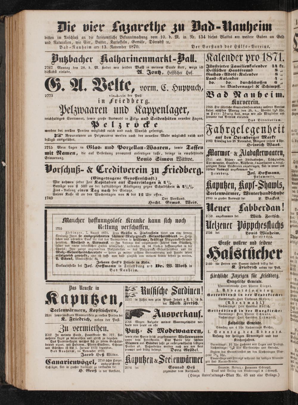 und Naturalien, wie Eier, Butter, Kartoffeln, Gemüse, Dörrobst ꝛc. Bad-Rauheim am 13. November 1870.
