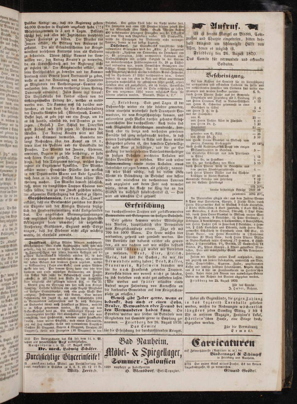 Gewiß gibt Jeder gerne, wenn er bedenkt, daß auch er einen Sohn, Bruder, Berwandten oder Freund bei den Verwundeten baben kann. Die Spenden werden wie seither im Bahnhöfe von Mitgliedern des Comités gerne in Empfang ge— nommen.— Friedberg den 26. August 1870.