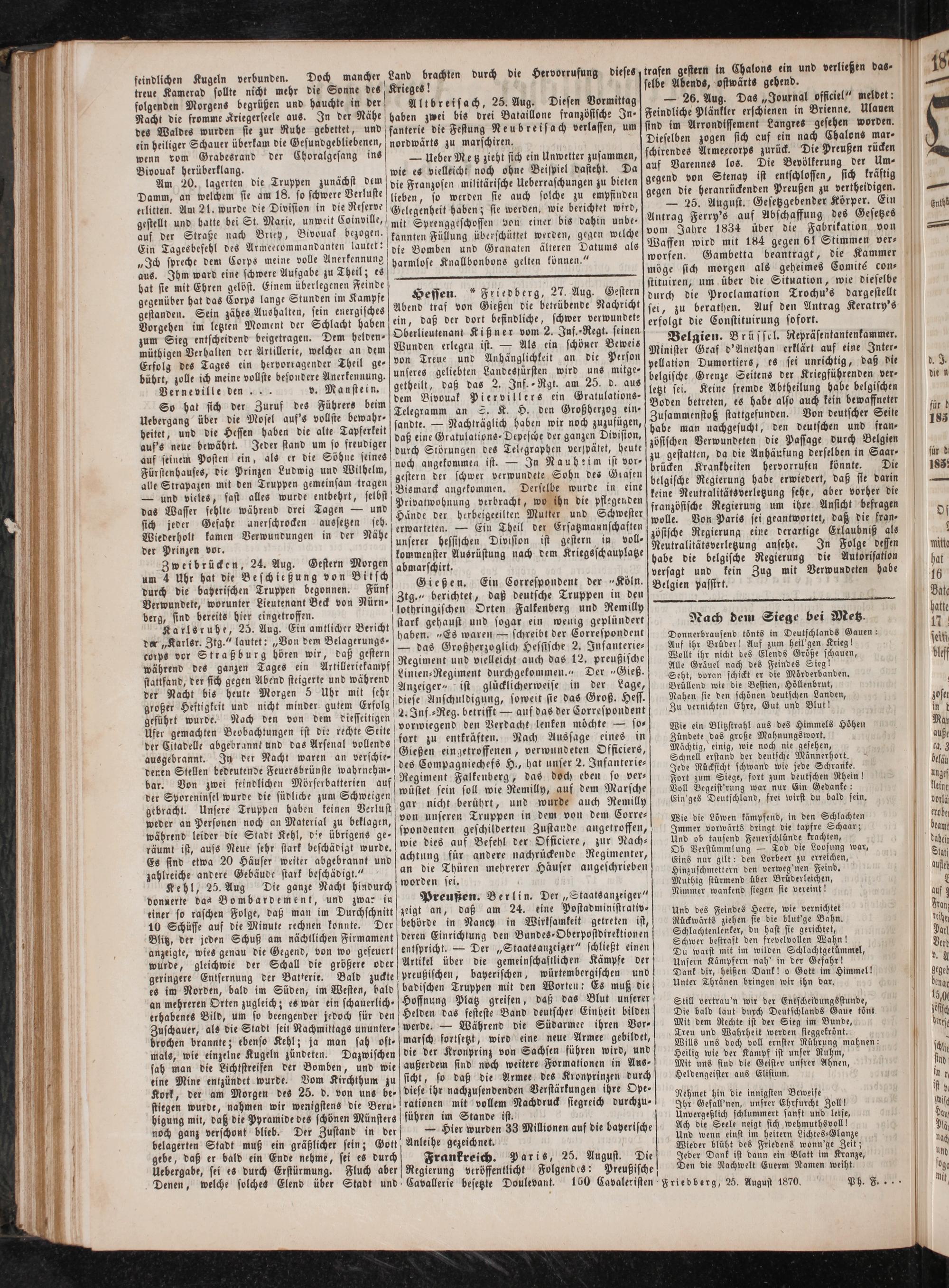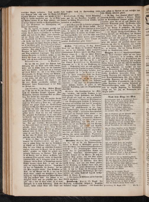 donnerte das Bombardement, und zwar in Preußen. Berlin. Der„Staatsanzeiger“ einer so raschen Folge, daß man im Durchschnitt zeigt an, daß am 24. eine Postadministrativ⸗ 10 Schüsse auf die Minute rechnen konnte. Der bebörde in Nancy in Wirksamkeit getreten ist, Blitz, der jeden Schuß am nächtlichen Firmament deren Einrichtung den Bundes⸗Oberpostdirektionen anzeigte, wies genau die Gegend, von wo gefeuert sentspricht.— Der„Staatsanzeiger“ schließt einen würde, gleichwie der Schall die größere oder Artikel über die gemeinschaftlichen Kämpfe der geringere Entfernung der Batterie. Bald zuckte preußischen, baßerischen, würtembergischen und es im Norden, bald im Süden, im Westen, bald badischen Truppen mit den Worten: Es muß die an mehreren Orten zugleich; es war ein schauerlich⸗ Hoffnung Platz greifen, daß das Blut unserer erhabenes Bild, um so beengender jedoch für den Helden das festeste Band deutscher Einheit bilden Zuschauer, als die Stadt seit Nachmittags ununter⸗ werde.— Während die Südarmer ihren Vor- brochen brannte; ebenso Kehl; ja man sah oft- marsch fortsetzt, wird eine neue Armee gebildet, mals, wie einzelne Kugeln zündeten. Dazwischen die der Kronprinz von Sachsen führen wird, und sah man die Lichtstreifen der Bomben, und wie außerdem sind noch weitere Formationen in Aus- eine Mine entzündet wurde. Vom Kirchthum zu sicht, so daß die Armee des Kronprinzen durch Kork, der am Morgen des 25. d. von uns be- diese ihr nachzusendenden Verstärkungen ihre Ope⸗ stiegen wurde, nahmen wir wenigstens die Beru; rationen mit vollem Nachdruck siegreich durchzu⸗ higung mit, daß die Pyramide des schönen Münsters führen im Stande ist.