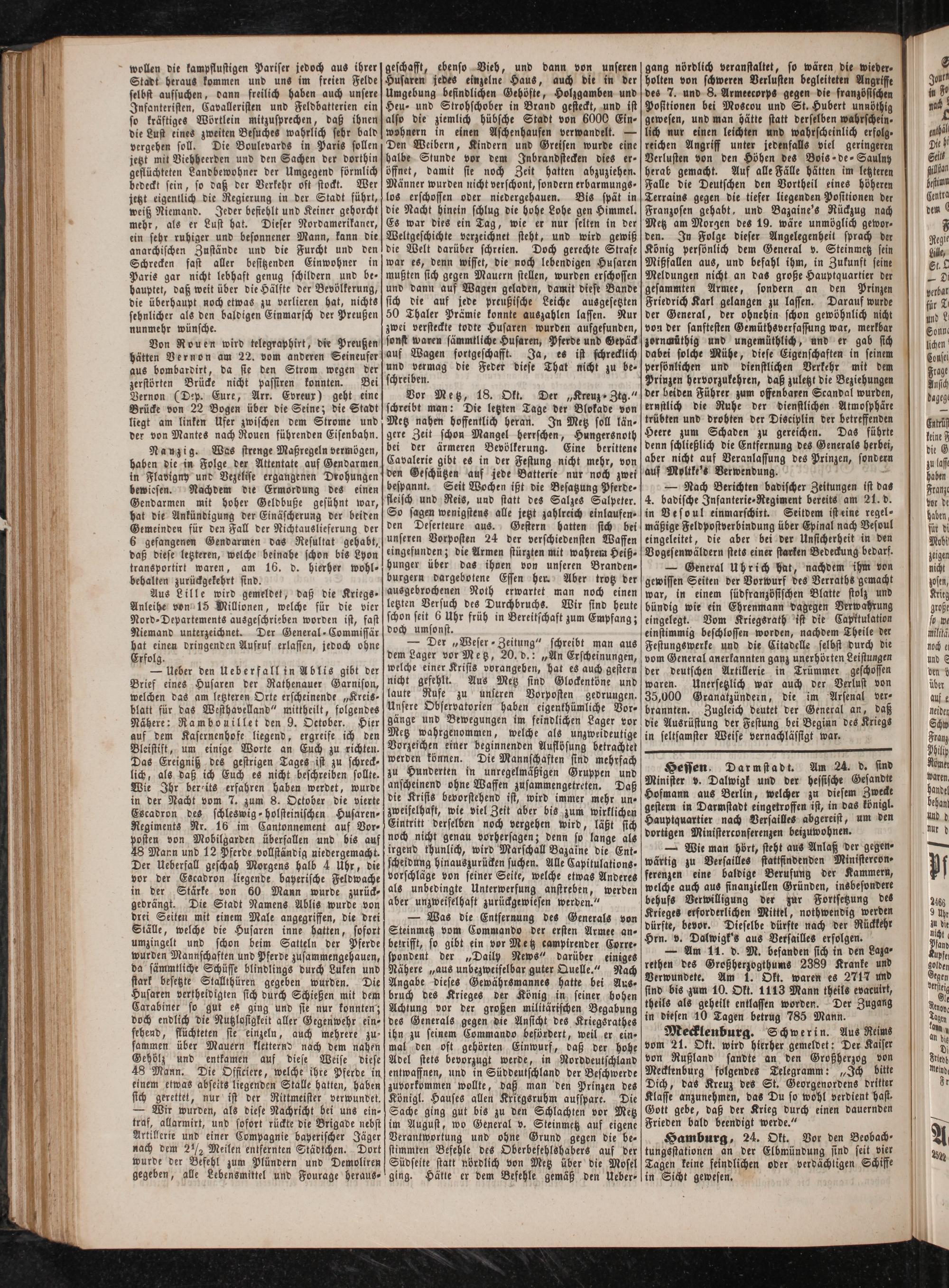 Hessen. Darmstadt. Am 24. d. sind Minister v. Dalwigk und der hessische Gesandte Hofmann aus Berlin, welcher zu diesem Zwecke gestern in Darmstadt eingetroffen ist, in das königl. Hauptquartier nach Versailles abgereist, um den dortigen Ministerconferenzen beizuwohnen.