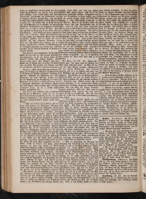 — Ueber den Ueberfall in Ablis gibt der Brief eines Husaren der Rathenauer Garnison, welchen das am letzteren Orte erscheinende„Kreis- blatt für das Westhavelland“ mittheilt, folgendes Nähere: Rambouillet den 9. October. Hier auf dem Kasernenhofe liegend, ergreife ich den Bleistift, um einige Worte an Euch zu richten. Das Ereigniß des gestrigen Tages ist zu schreck⸗ lich, als daß ich Euch es nicht beschreiben sollte. Wie Ihr bereits erfahren haben werdet, wurde in der Nacht vom 7. zum 8. October die vierte Escadron des schleswig⸗holsteinischen Husaren⸗ Regiments Nr. 16 im Cantonnement auf Vor⸗ posten von Mobilgarden überfallen und bis auf 48 Mann und 12 Pferde vollständig niedergemacht. Der Ueberfall geschah Morgens halb 4 Uhr, die vor der Escadron liegende bayerische Feldwache in der Stärke von 60 Mann wurde zurück⸗ gedrängt. Die Stadt Namens Ablis wurde von drei Seiten mit einem Male angegriffen, die drei Ställe, welche die Husaren inne hatten, sofort umzingelt und schon beim Satteln der Pferde wurden Mannschaften und Pferde zusammengehauen, da sämmtliche Schüsse blindlings durch Luken und stark besetzte Stallthüren gegeben wurden. Die Husaren vertheidigten sich durch Schießen mit dem Carabiner so gut es ging und sie nur konnten; doch endlich die Nutzlosigkeit aller Gegenwehr ein⸗ sehend, flüchteten sie einzeln, auch mehrere zu⸗ sammen über Mauern kletternd nach dem nahen Gehölz und entkamen auf diese Weise diese 48 Mann. Die Officiere, welche ihre Pferde in. einem etwas abseits liegenden Stalle hatten, haben sich gerettet, nur ist der Rittmeister verwundet. — Wir wurden, als diese Nachricht bei uns ein⸗ traf, allarmirt, und sofort rückte die Brigade nebst Artillerie und einer Compagnie bayerischer Jäger nach dem 2½ Meilen entfernten Städtchen. Dort