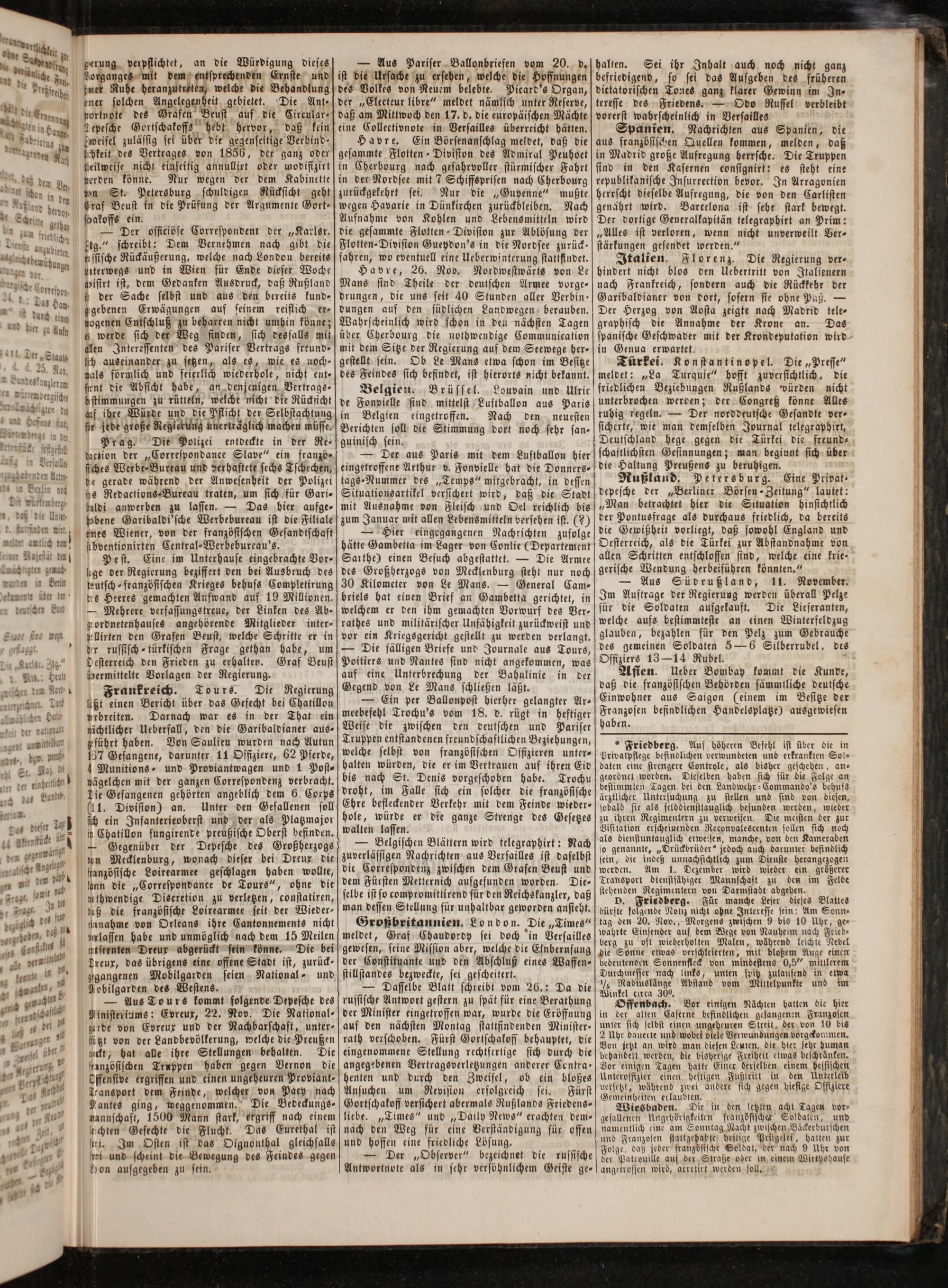 — Belgischen Blättern wird telegraphirt: Nach zuverlässigen Nachrichten aus Versailles ist daselbst die Correspondenz zwischen dem Grafen Beust und dem Fürsten Metternich aufgefunden worden. Die— selbe ist so compromittirend für den Reichskanzler, daß man dessen Stellung für unhaltbar geworden ansieht.