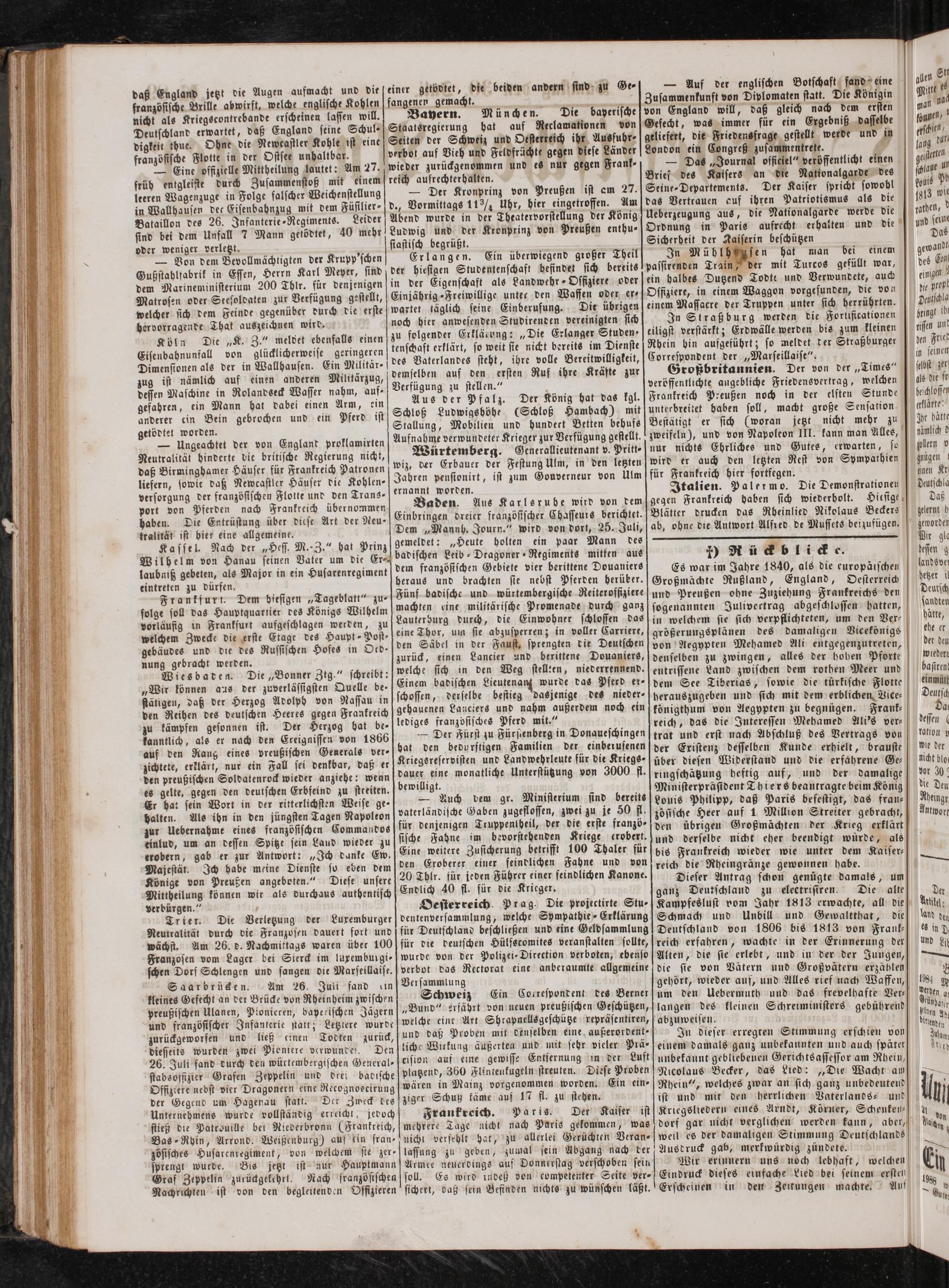 Es war im Jahre 1840, als die europäischen Großmächte Rußland, England, Oesterreich und Preußen ohne Zuziehung Frankreichs den sogenannten Julivectrag abgeschlossen hatten, in welchem sie sich verpflichteten, um den Ver⸗ größerungsplänen des damaligen Vicekönigs von Aegypten Mehamed Ali entgegenzutreten, denselben zu zwingen, alles der hohen Pforte entrissene Land zwischen dem rothen Meer und dem See Tiberias, sowie die tuͤrkische Flotte herauszugeben und sich mit dem erblichen Vice⸗ königthum von Aegypten zu begnügen. Frank⸗ reich, das die Interessen Mehamed Ali's ver— trat und erst nach Abschluß des Vertrags von der Existenz desselben Kunde erhielt, brauste über diesen Widerstand und die erfahrene Ge— ringschätzung heftig auf, und der damalige Ministerpräsident Thiers beantragte beim König Louis Philipp, daß Paris befestigt, das frau zoͤsische Heer auf 1 Million Streiter gebracht, den übrigen Großmächten der Krieg erklärt und derselbe nicht eher beendigt würde, als bis Frankreich wieder wie unter dem Kaiser⸗ reich die Rheingränze gewonnen habe.